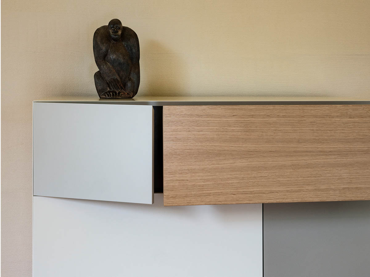 - De kast heeft een primaire kleur als basis, aangevuld met drie accenttinten in lak en eikenfineer.