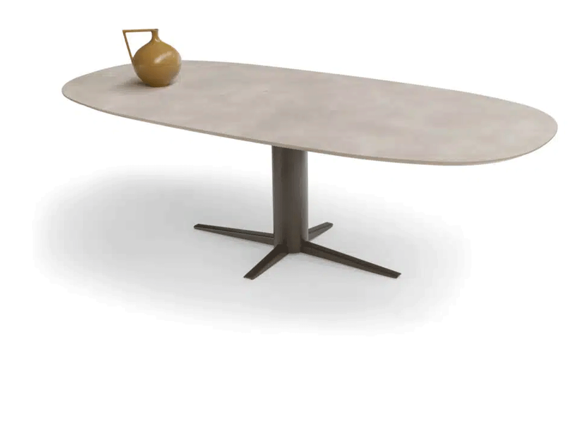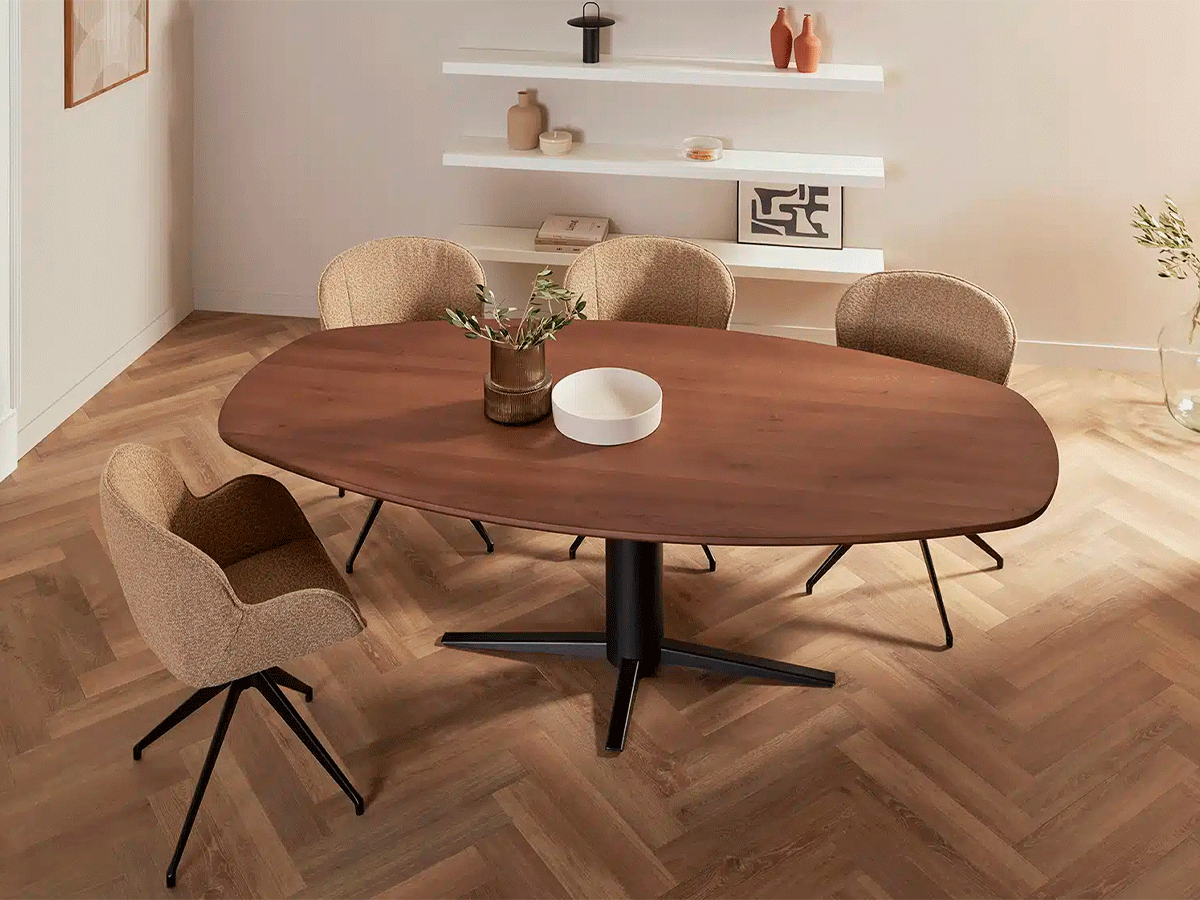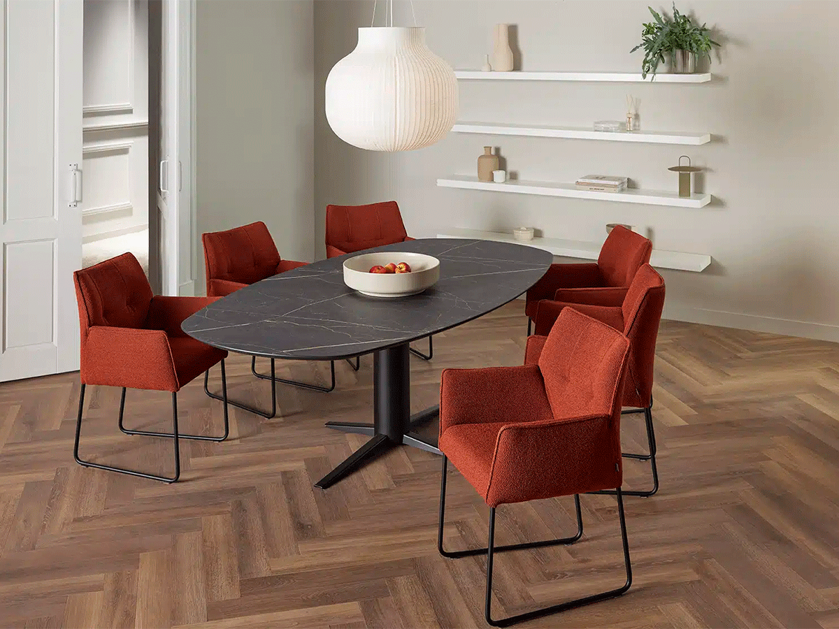 Wat de Storq eettafel extra bijzonder maakt, is de subtiele afwijking van het standaard ontwerp. Het tafelblad heeft een verfijnde superellips vorm, die net wat spannender oogt dan een traditionele ovale tafel. De metalen voetplaat volgt deze vorm, waardoor een harmonieus en evenwichtig geheel ontstaat.