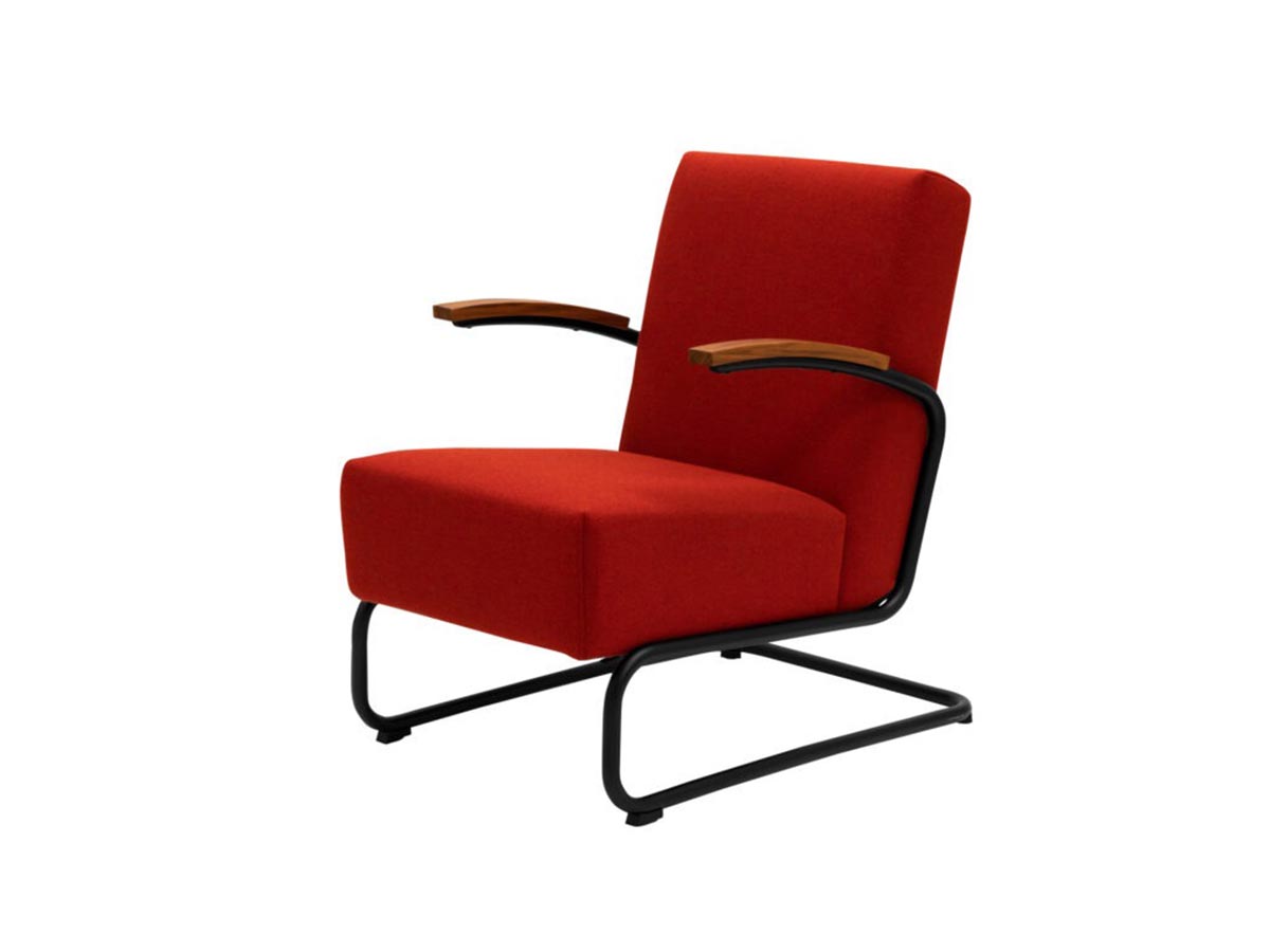 Het buisframe, verkrijgbaar in glanzend chroom of mat zwart gepoedercoat staal, geeft de fauteuil haar karakteristieke lichtheid. De standaard armleggers zijn van zwart bakeliet, maar voor een extra klassieke of warme uitstraling kunt u kiezen voor houten armleggers in beuken of noten (tegen meerprijs) — ideaal om de fauteuil harmonieus te laten samensmelten met uw interieur.