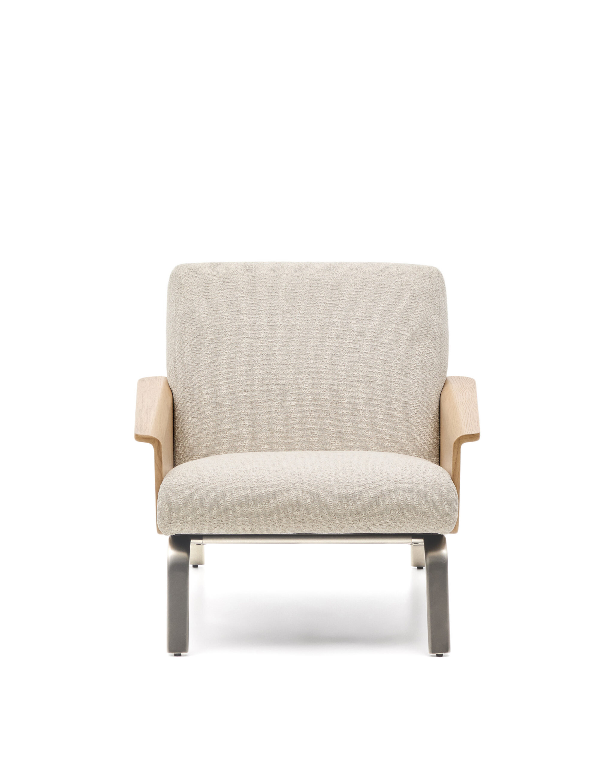 Deze collectie met een elegant en tijdloos ontwerp speelt de hoofdrol in elke ruimte. De chenille bekleding met fijne structuur zorgt niet alleen voor een warme en elegante textuur, maar is ook gemaakt van 100% gerecycled polyester met een waterafstotende behandeling. Dit materiaal is afkomstig van een Global Recycled Standard-gecertificeerde leverancier, wat minder gebruik van grondstoffen en nieuw materiaal garandeert. Bovendien is de stof OEKO-TEX® STANDARD 100-gecertificeerd wat een ecologisch veilige en milieuverantwoorde productie garandeert. De structuur van deze fauteuil combineert de weerstand van multiplex van 18 mm dik, bedekt met eikenfineer, met de visuele aantrekkingskracht van de strak gelijnde armleuningen. De poten zijn gemaakt geborsteld roestvrij stalen buizen met een diameter van 1,8 mm en geven het ontwerp een eigentijds en stabiel uiterlijk. De gemiddelde hardheid van de zitting is ideaal voor dagelijks gebruik, dankzij een zorgvuldige combinatie van banden, veren en schuimlagen met hoge dichtheid (35 kg/m³ en 40 kg/m³), die stevigheid, duurzaamheid en uitstekend comfort bieden.