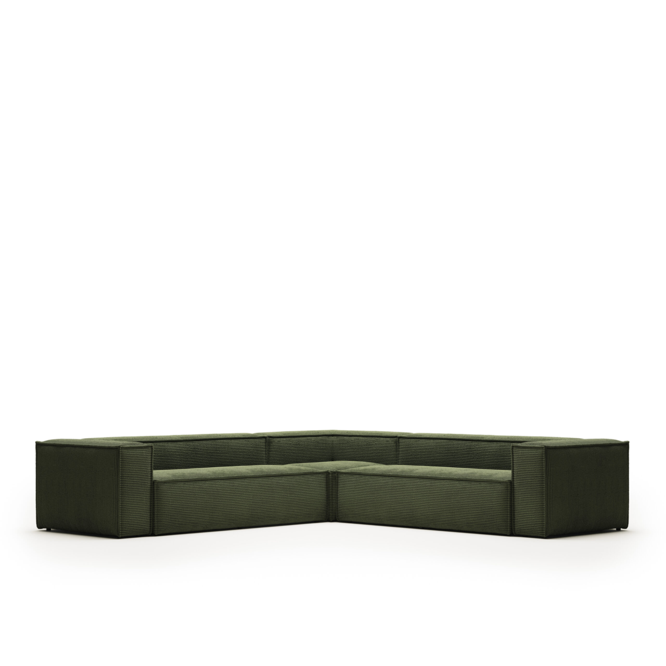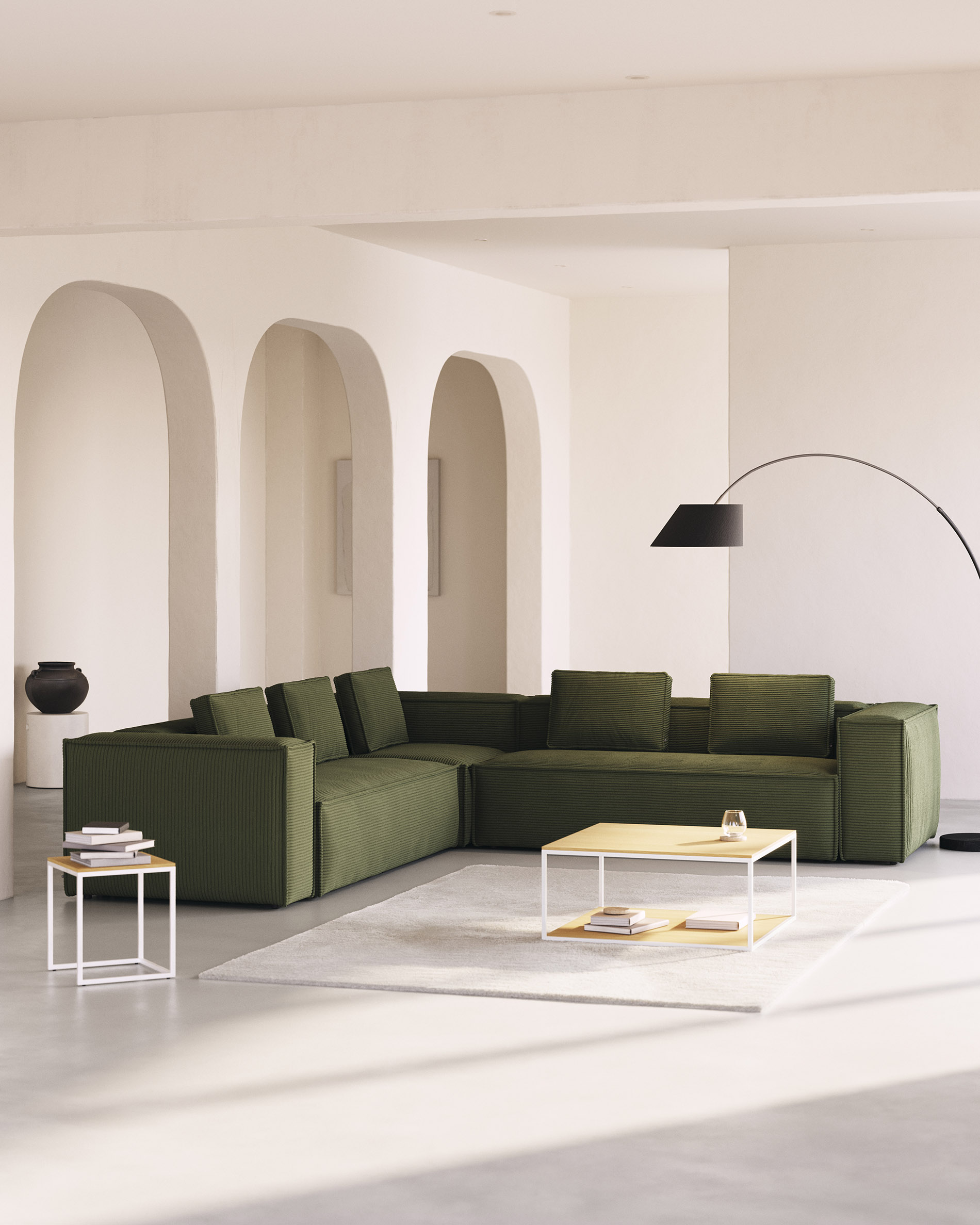 Deze iconische collectie wordt gedefinieerd door de brede proporties en gestructureerde lijnen. Daardoor ontstaat een object dat in elke omgeving stabiliteit en sereniteit uitstraalt. De poten hebben een onzichtbaar effect en geven de bank een gevoel van visuele lichtheid. Dit benadrukt zijn aanwezigheid en wordt de hedendaagse esthetiek van je woonkamer versterkt met een uniek en tijdloos ontwerp. De Blok-bank combineert elegantie en functionaliteit zodat hij op natuurlijke wijze in moderne ruimtes past. De bekleding is gemaakt van dik ribfluweel, dat zacht aanvoelt en zeer goed bestand is tegen slijtage en licht. Het biedt een omhullende textuur en is uitzonderlijk duurzaam. Het is perfect voor dagelijks gebruik en de schoonheid blijft intact in de loop van de tijd. De middelzachte zitting combineert een basis van 30 kg/m³ zacht schuim met een laag hard schuim van 20 kg/m³ en een toplaag van 20 kg/m³ zacht schuim. Dit zorgt voor de perfecte balans tussen comfort en ondersteuning, ideaal voor zowel alledaagse ontspanning als het ontvangen van gasten. De rugleuning biedt extra comfort dankzij de kern van 20 kg/m³ hard schuim bedekt met 20 kg/m³ zacht schuim. Hij nodigt je uit om achterover te leunen en je te ontspannen. Voor een nog comfortabelere ervaring raden wij u aan om het zitcomfort aan te vullen met de kussens uit de collectie. Deze zijn apart verkrijgbaar. De interne structuur van vurenhout is FSC Mix Credit gecertificeerd, gemaakt van een combinatie van materialen uit FSC-gecertificeerde bossen en FSC-gecontroleerd hout. Bovendien garandeert lokale productie in Europa hoge kwaliteitsnormen en vermindert het de impact op het milieu. De leverancier van de stoffen is OEKO-TEX® STANDARD 100 gecertificeerd voor een ecologisch veilige en milieuverantwoorde productie. Blok is de must-have die opvalt door zijn ontwerp, comfort en vermogen om elke kamer te transformeren.