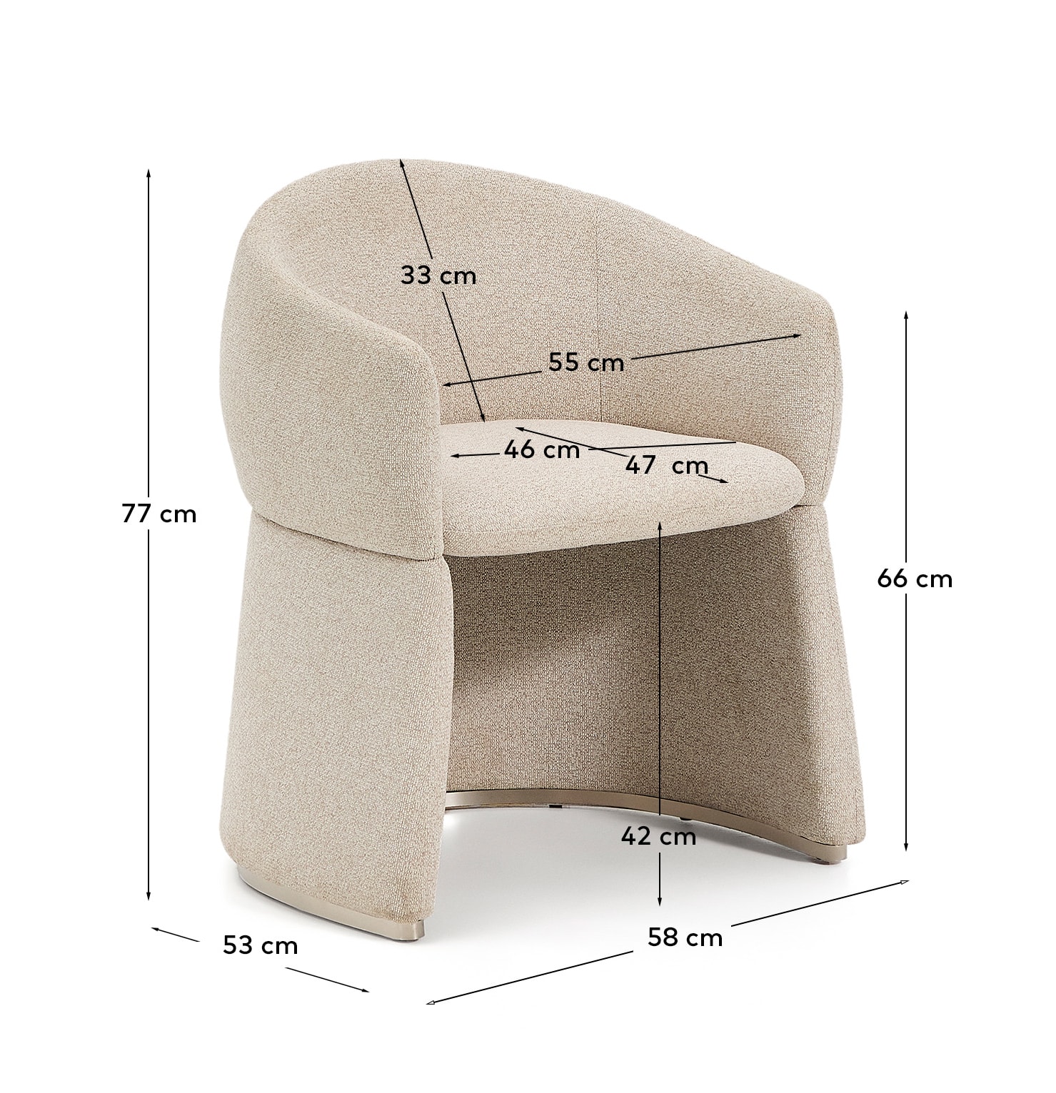 Deze stoel valt op door zijn sculpturale ontwerp, waarbij royale, omhullende vormen in evenwicht worden gehouden door een subtiel, verfijnd silhouet. De brede, uitnodigende zitting rust op een gestoffeerde multiplex basistablet met een metalen frame aan de randen om de stof te beschermen. De bekleding is gemaakt van chenille met een fijne structuur: voelt zacht aan, is bestand tegen dagelijks gebruik en gemaakt van 100% gerecycled polyester van een Global Recycled Standard-gecertificeerde leverancier. De stof heeft een waterafstotende behandeling ondergaan en is OEKO-TEX® STANDARD 100-gecertificeerd wat een ecologisch veilige en milieuverantwoorde productie garandeert. De zitting is van gemiddelde hardheid dankzij de combinatie van banden en veren met injectieschuim met een dichtheid van 55 kg/m³, waardoor zijn stevigheid en vorm na verloop van tijd behouden wordt. De vilten beschermers op de poten voorkomen markeringen en krassen op de vloer en een metalen frame op de randen beschermt de stof. Een meubelstuk dat ontworpen is om lang mee te gaan, en functioneel is in zowel huishoudelijke als commerciële ruimtes.
