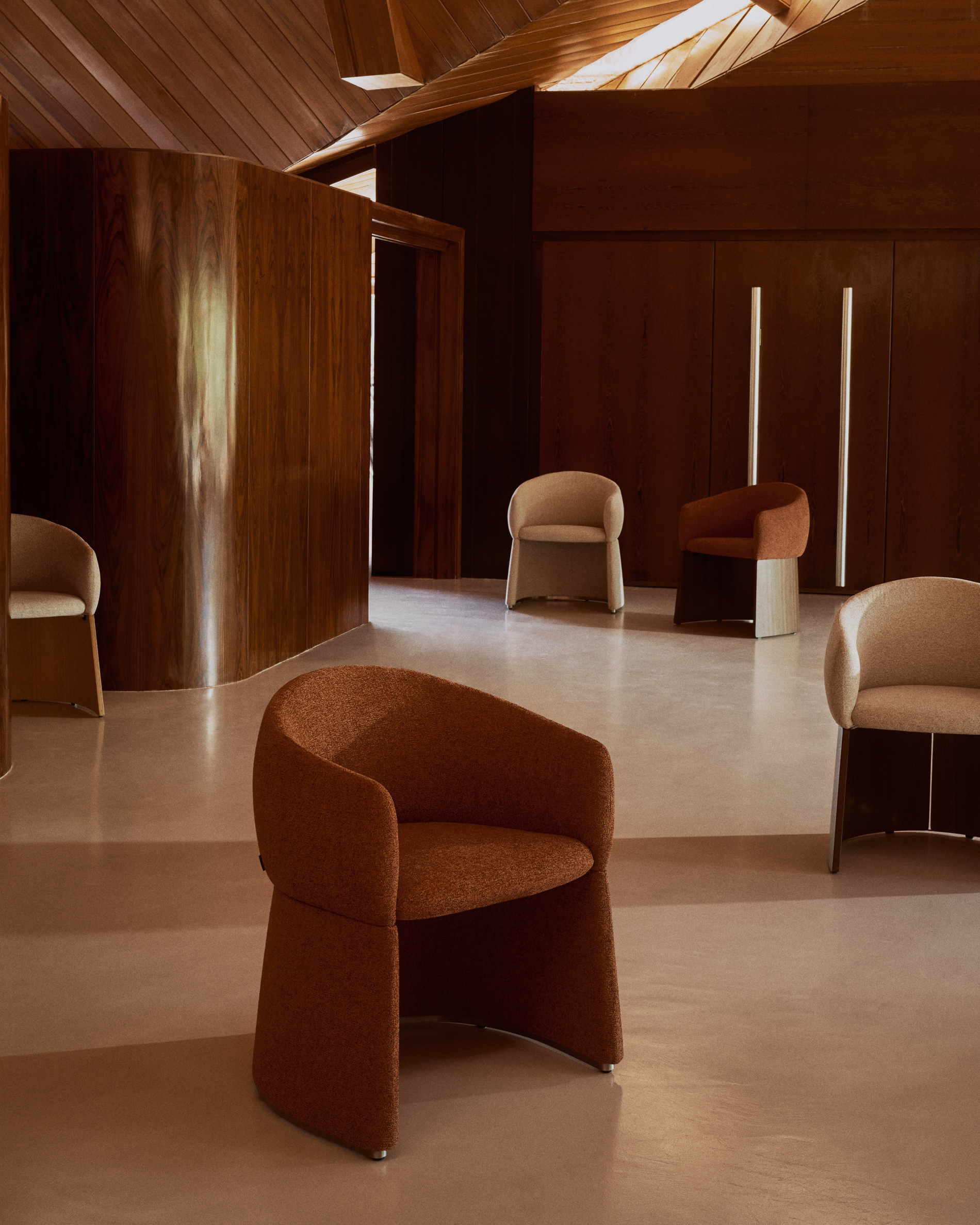 Deze stoel valt op door zijn sculpturale ontwerp, waarbij royale, omhullende vormen in evenwicht worden gehouden door een subtiel, verfijnd silhouet. De brede, uitnodigende zitting rust op een gestoffeerde multiplex basistablet met een roestvrijstalen frame aan de randen om de stof te beschermen. De bekleding is gemaakt van chenille met een fijne structuur: voelt zacht aan, is bestand tegen dagelijks gebruik en gemaakt van 100% gerecycled polyester van een Global Recycled Standard-gecertificeerde leverancier. De stof heeft een waterafstotende behandeling ondergaan en is OEKO-TEX® STANDARD 100-gecertificeerd wat een ecologisch veilige en milieuverantwoorde productie garandeert. De zitting is van gemiddelde hardheid dankzij de combinatie van banden en veren met injectieschuim met een dichtheid van 55 kg/m³, waardoor zijn stevigheid en vorm na verloop van tijd behouden wordt. De vilten beschermers op de poten voorkomen markeringen en krassen op de vloer en een metalen frame op de randen beschermt de stof. Een meubelstuk dat ontworpen is om lang mee te gaan, en functioneel is in zowel huishoudelijke als commerciële ruimtes.