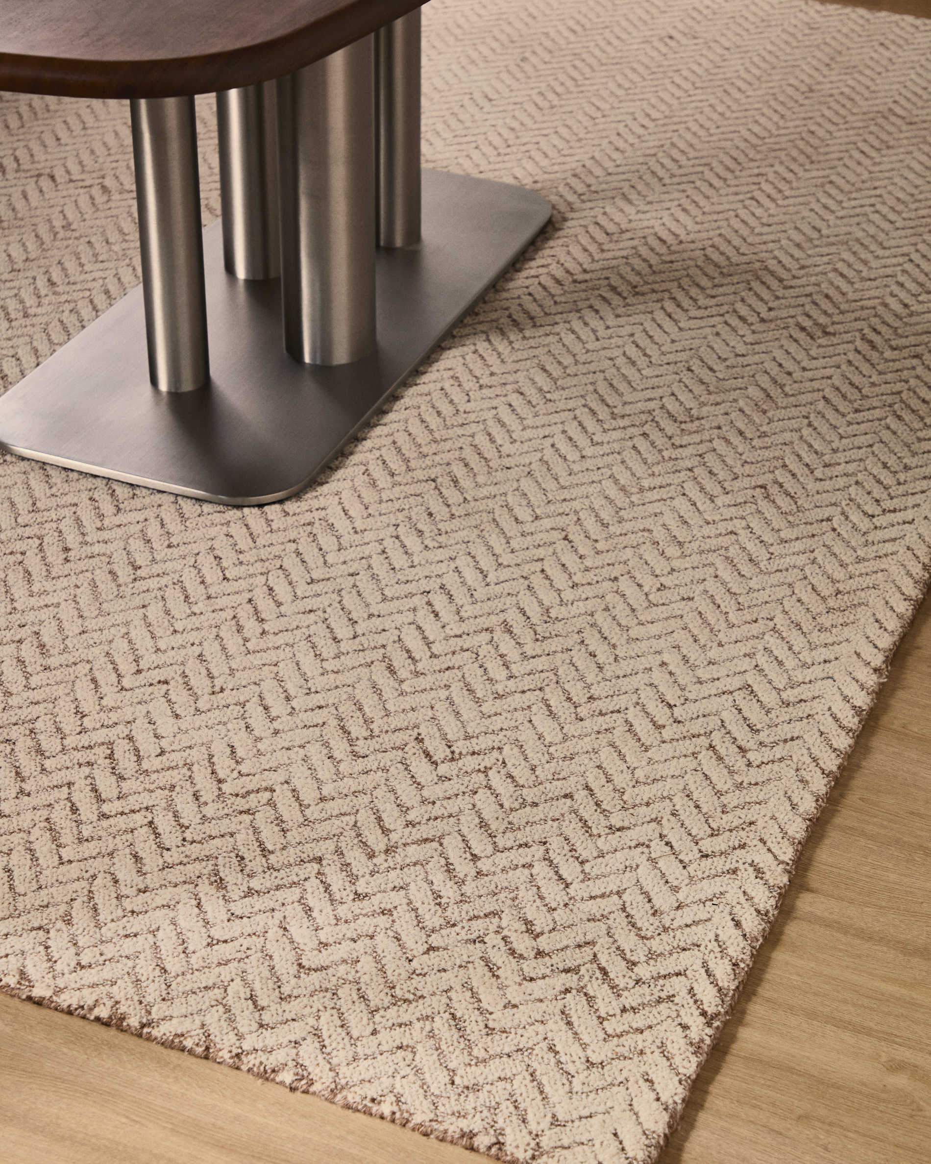 Het tapijt is ontworpen met een gevlochten jacquardmotief dat aan elk kamer textuur en karakter toevoegt. Gemaakt van 100% wol en elk stuk is met de hand geweven. Daardoor heeft het tapijt exclusiviteit en een unieke afwerking, met kleine variaties die de authenticiteit versterken. Wol is een warm en comfortabel materiaal, ideaal om gezelligheid en verfijning toe te voegen aan elke kamer. Tijdens de eerste paar maanden kan wol op natuurlijke wijze vezels afgeven; we raden aan om in de richting van de vezels te stofzuigen en eventuele losse draadjes af te knippen met een schaar zodat het er netjes blijft uitzien.