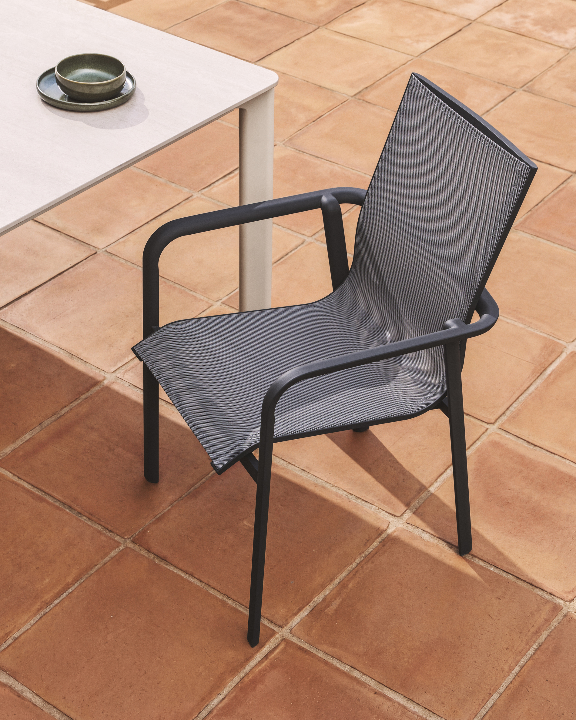 De Canea stoel combineert lichtheid, bestendigheid en comfort. De aluminium structuur is bestand tegen roest, corrosie en blootstelling aan de zon, waardoor hij er na verloop van tijd goed blijft uitzien. De zitting en rugleuning zijn gemaakt van textileen, een ademende synthetische stof die stevigheid en comfort biedt, zelfs na voortdurend gebruik. Dankzij het stapelbare ontwerp kunnen de stoelen gemakkelijk worden opgeborgen als ze niet worden gebruikt en de poten zijn voorzien van plastic beschermers om de vloer te beschermen en oppervlakken in goede staat te houden.