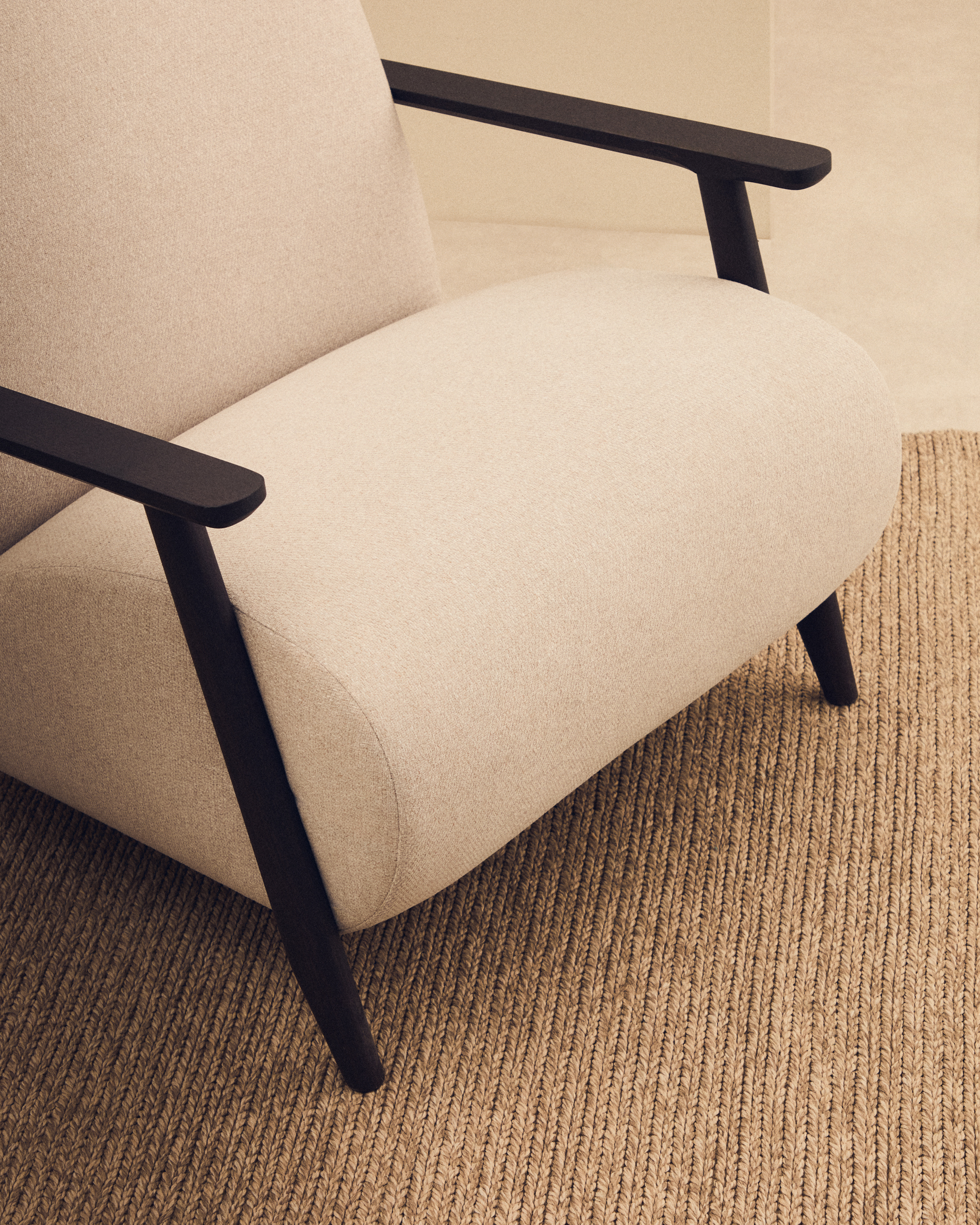Het ontwerp van deze fauteuil wordt gedefinieerd door zijn eenvoudige, minimalistische karakter. Een informele stijl die wordt bereikt door de combinatie van de zichtbare structuur van de fauteuil, in massief essenhout, en de bekleding.