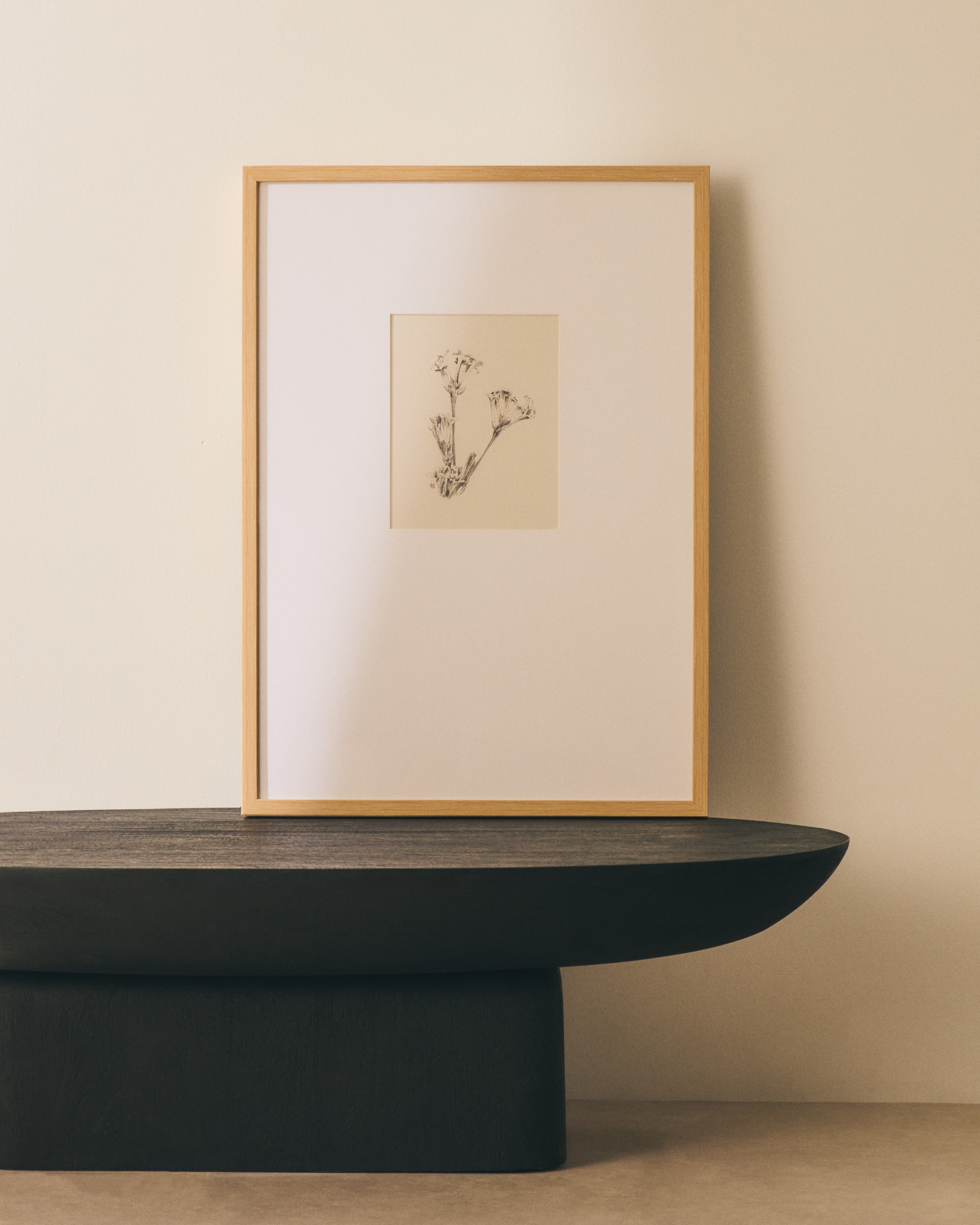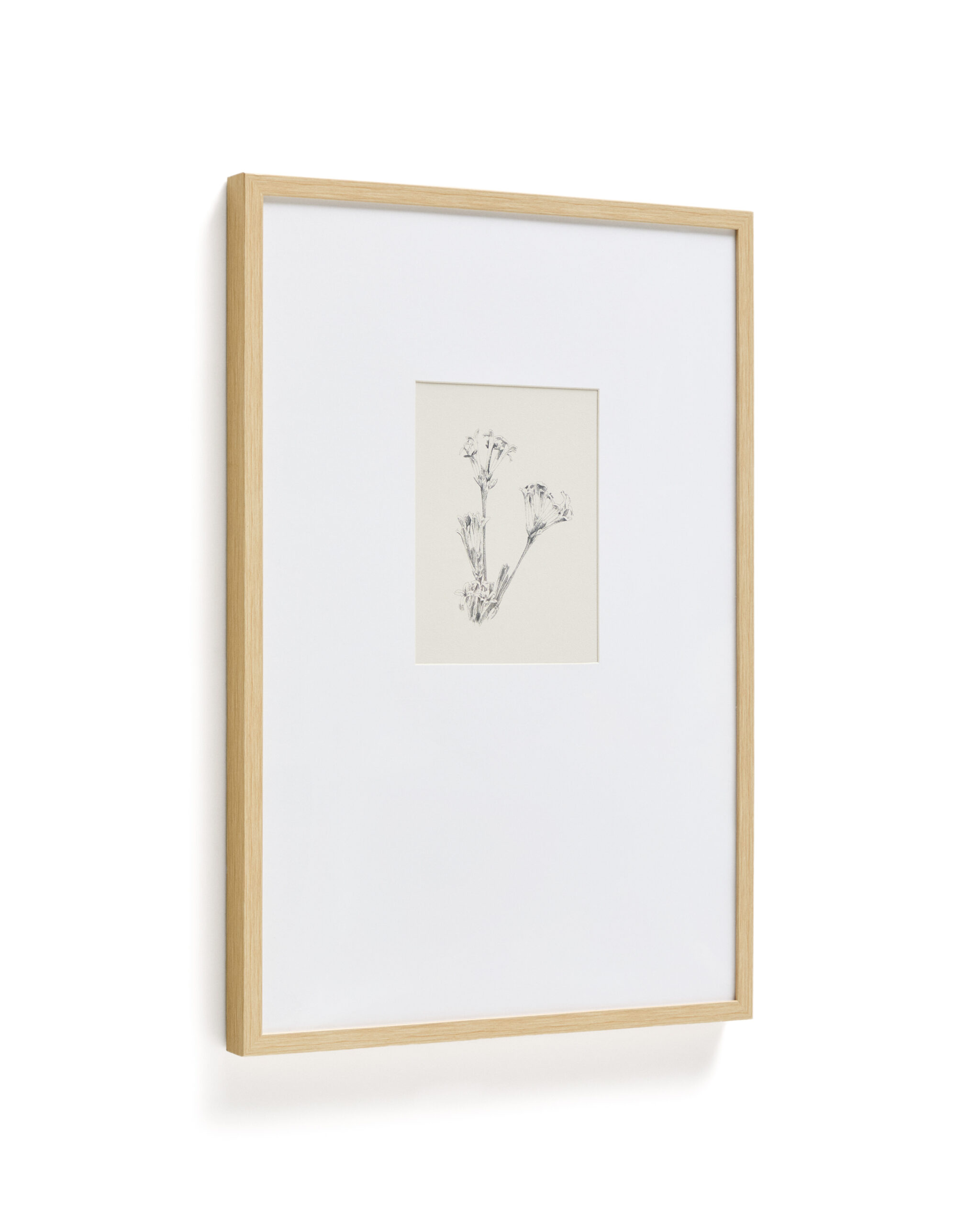 Dit schilderij valt op door de gedrukte illustratie in botanische stijl, uitgevoerd in potlood met een patroon dat doet denken aan traditionele graveertechnieken. Elke streek weerspiegelt de precisie en delicatesse van klassieke botanische tekeningen en brengt karakter en verfijning in de kamer. De illustratie is gevat in een breed passe-partout dat hem omlijst, voor elegantie zorgt en de afbeelding laat ademen, voor een evenwichtig en tijdloos visueel effect. Een veelzijdig werk voor wie op zoek is naar decoratieve kunst met een subtiele aanwezigheid.