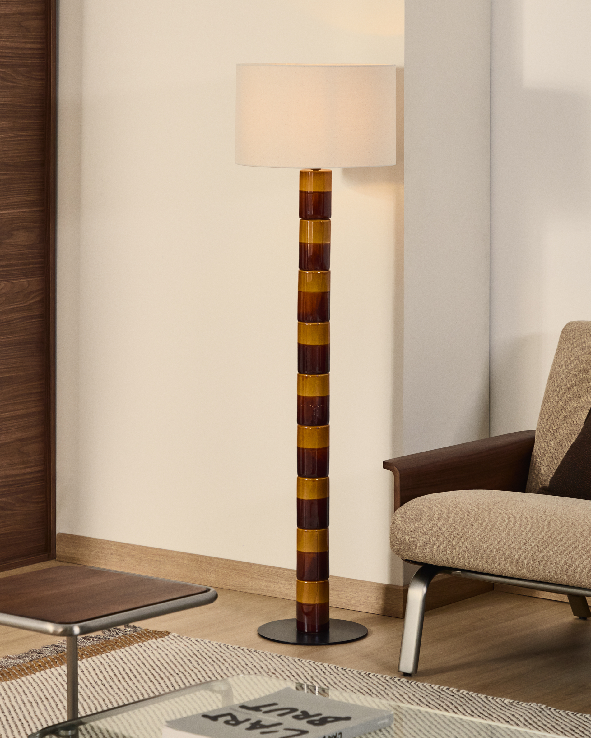 Deze collectie valt op door de basis van geëmailleerd keramiek, bewerkt in afwisselende stroken van warme tinten, die dynamiek en persoonlijkheid brengen in elke kamer. De katoenen kap filtert het licht en creëert een zachte en omhullende sfeer, perfect voor woonkamers, slaapkamers of leeshoeken. Het slanke, verticale ontwerp versterkt de aanwezigheid van de lamp, terwijl de geëmailleerde afwerking op de basis voor visuele aantrekkingskracht zorgt. De bedrading is bedekt met zeer zachte stof en voegt een vleugje verfijning en een aangename tactiele ervaring toe. Compatibel met E27-lampen van max. 40 W. Deze zijn apart verkrijgbaar.