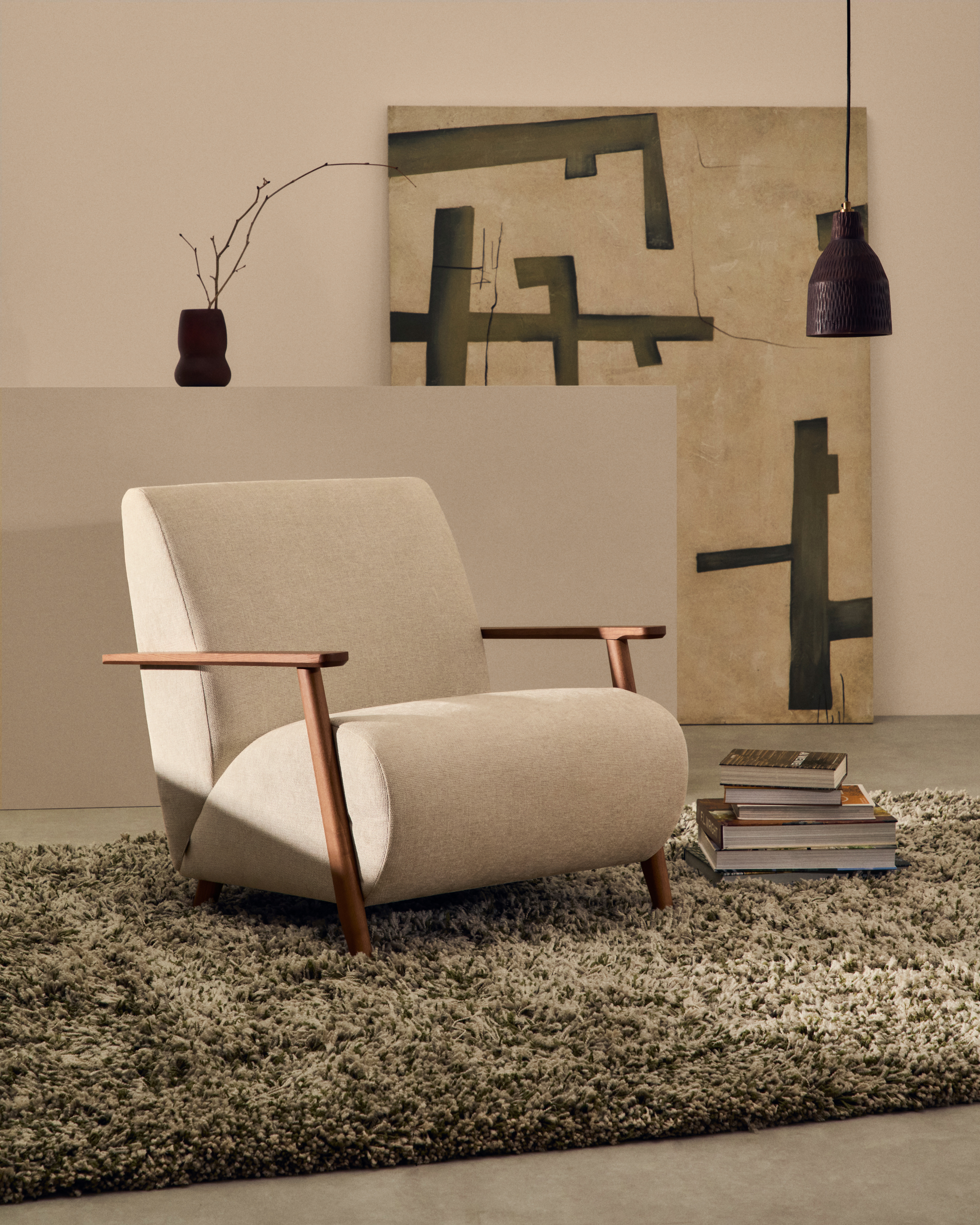 Het ontwerp van deze fauteuil wordt gekenmerkt door zijn eenvoudige en minimalistische karakter. Een ontspannen stijl die wordt bereikt door de combinatie van de zichtbare structuur van de fauteuil, gemaakt van massief essen hout, en de bekleding.