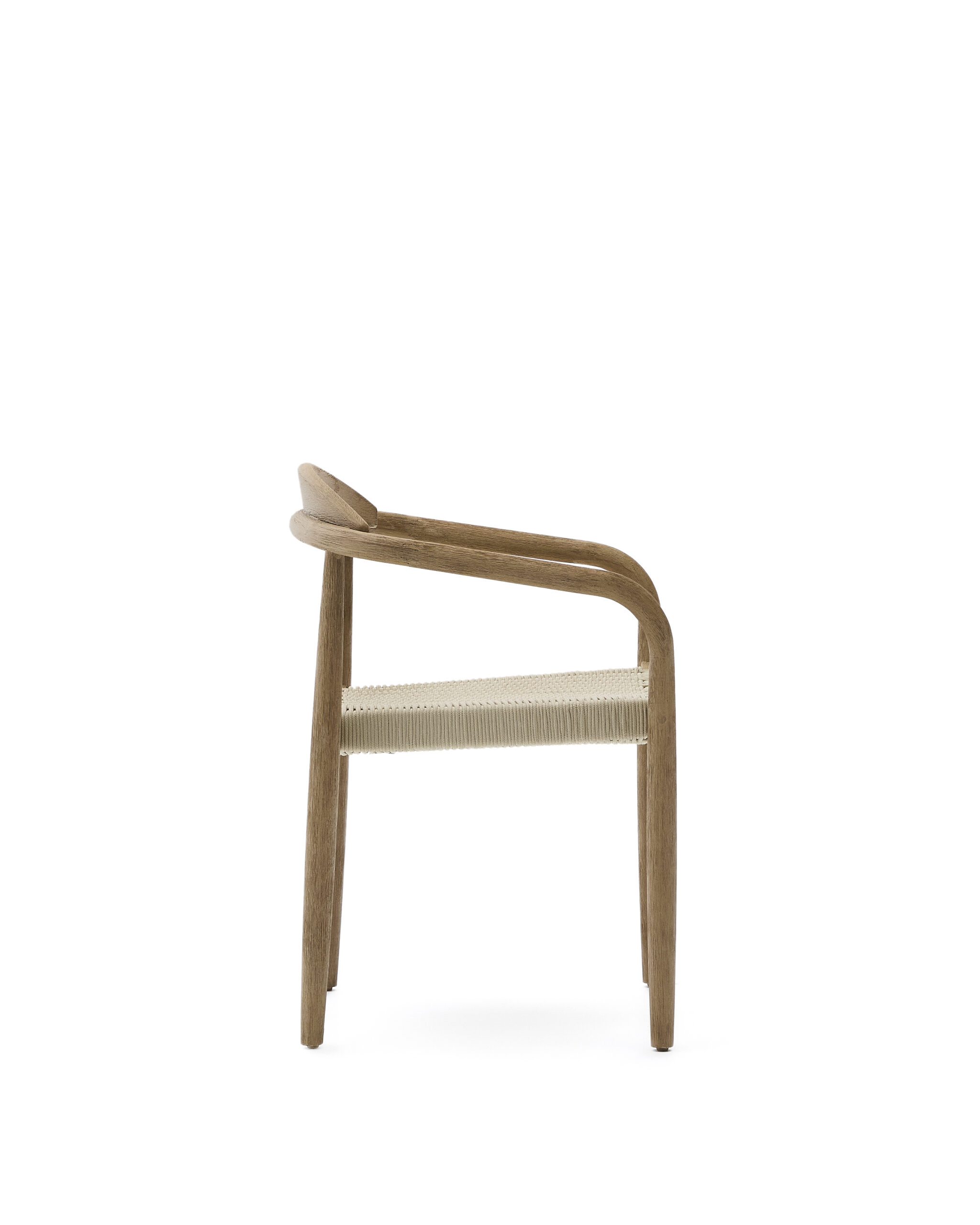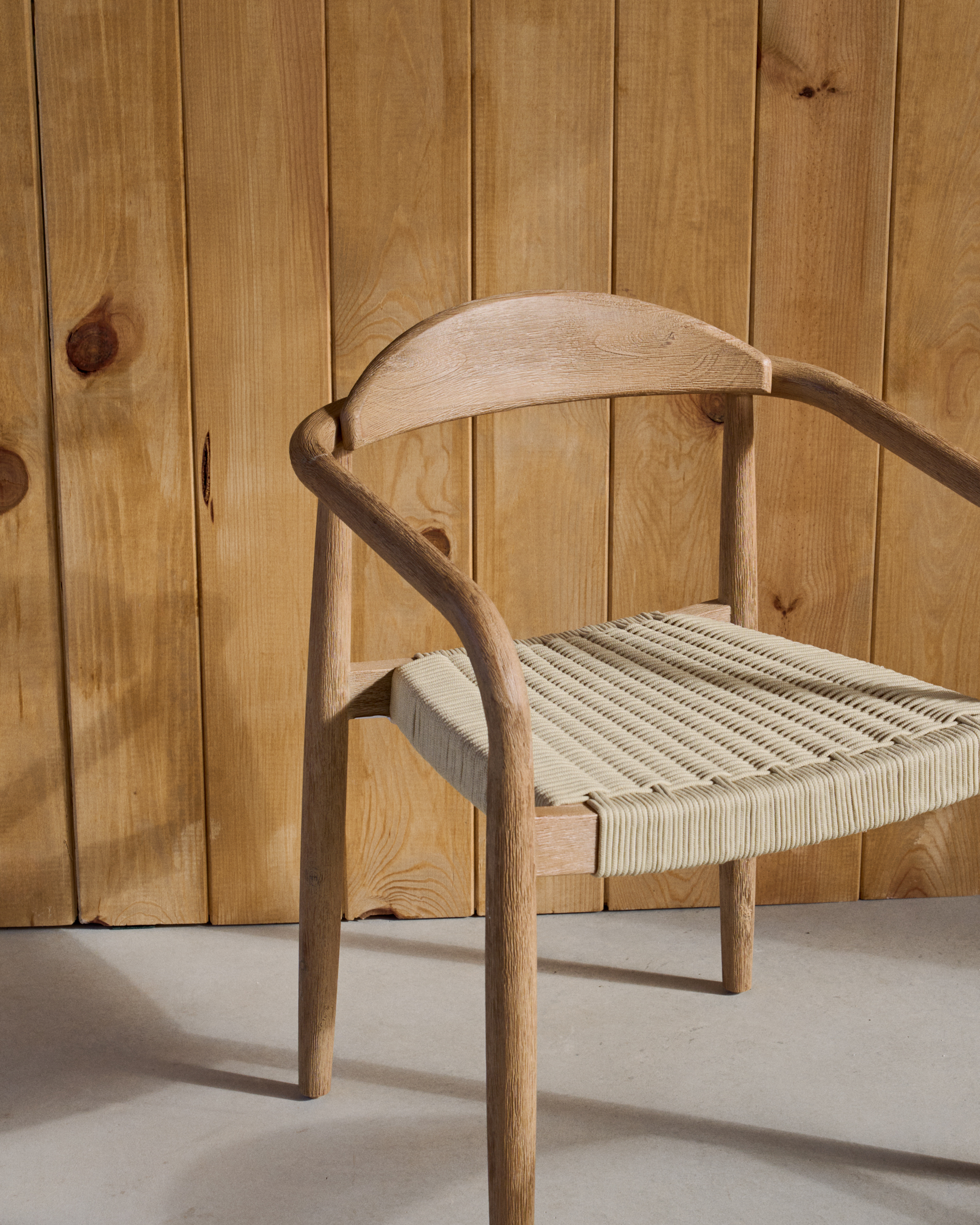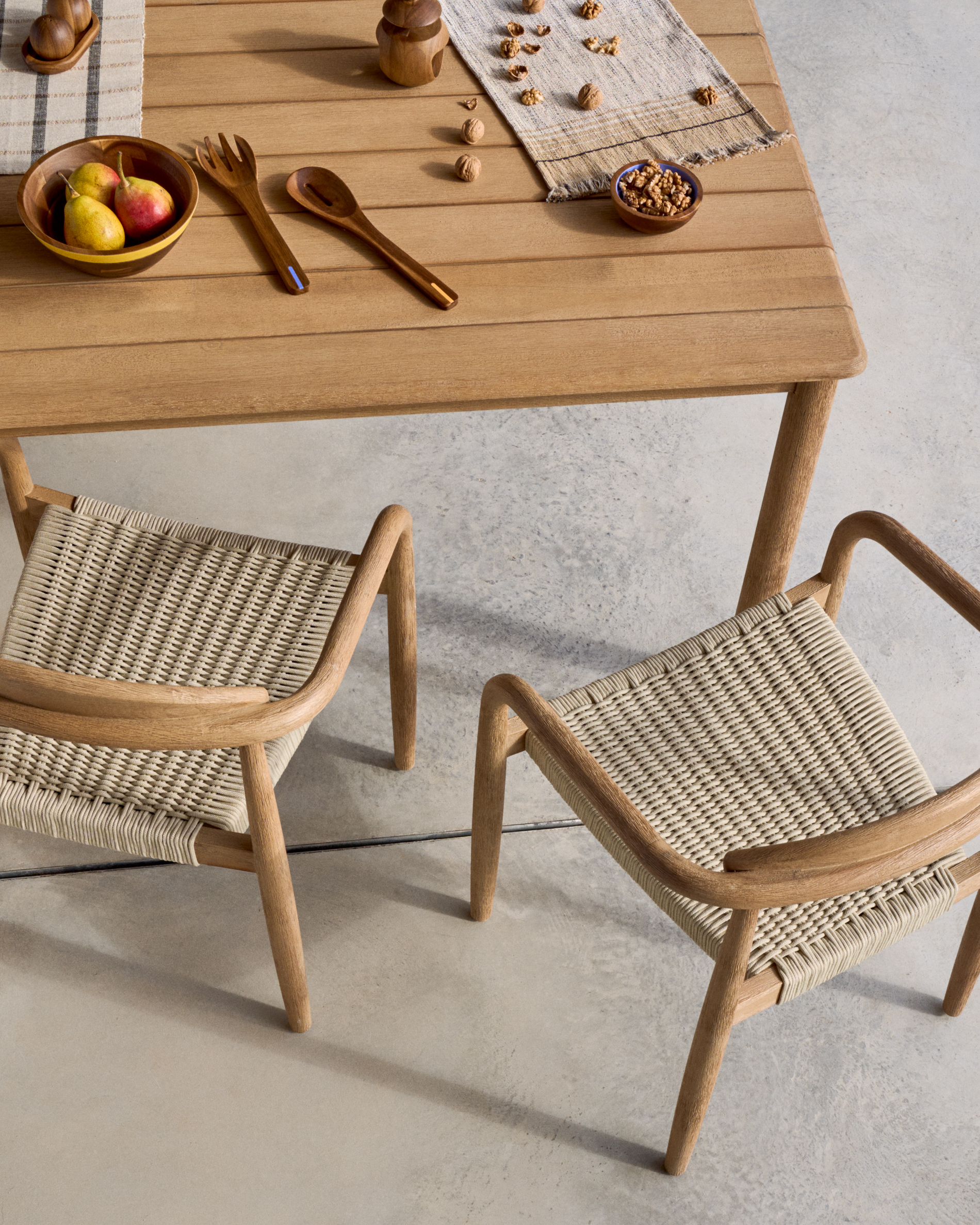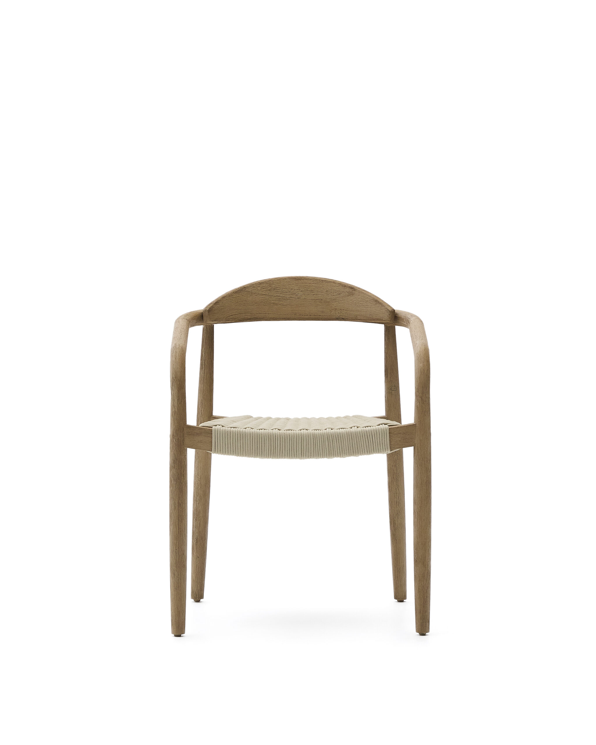 De Nina stoel is een expressie van warm en authentiek design. De structuur van massief acaciahout, met een natuurlijke afwerking die de unieke nerven en tinten benadrukt, maakt elke stoel uniek. Dit ontwerp weerspiegelt een toewijding aan duurzaamheid, aangezien het gebruikte hout 100% FSC™-gecertificeerd is, met een garantie voor een verantwoord bosbeheermodel. De zitting, gemaakt van UV-bestendig, handgeweven touw, voegt niet alleen een uniek decoratief tintje toe, maar biedt ook stevigheid en comfort. Met zijn veelzijdige ontwerp is de Nina stoel geschikt voor zowel binnen als buiten en past hij stijlvol in elke ruimte. Bovendien maken de stapelbare functionaliteit en ingebouwde armleuningen de stoel tot een praktische keuze zonder afbreuk te doen aan elegantie.