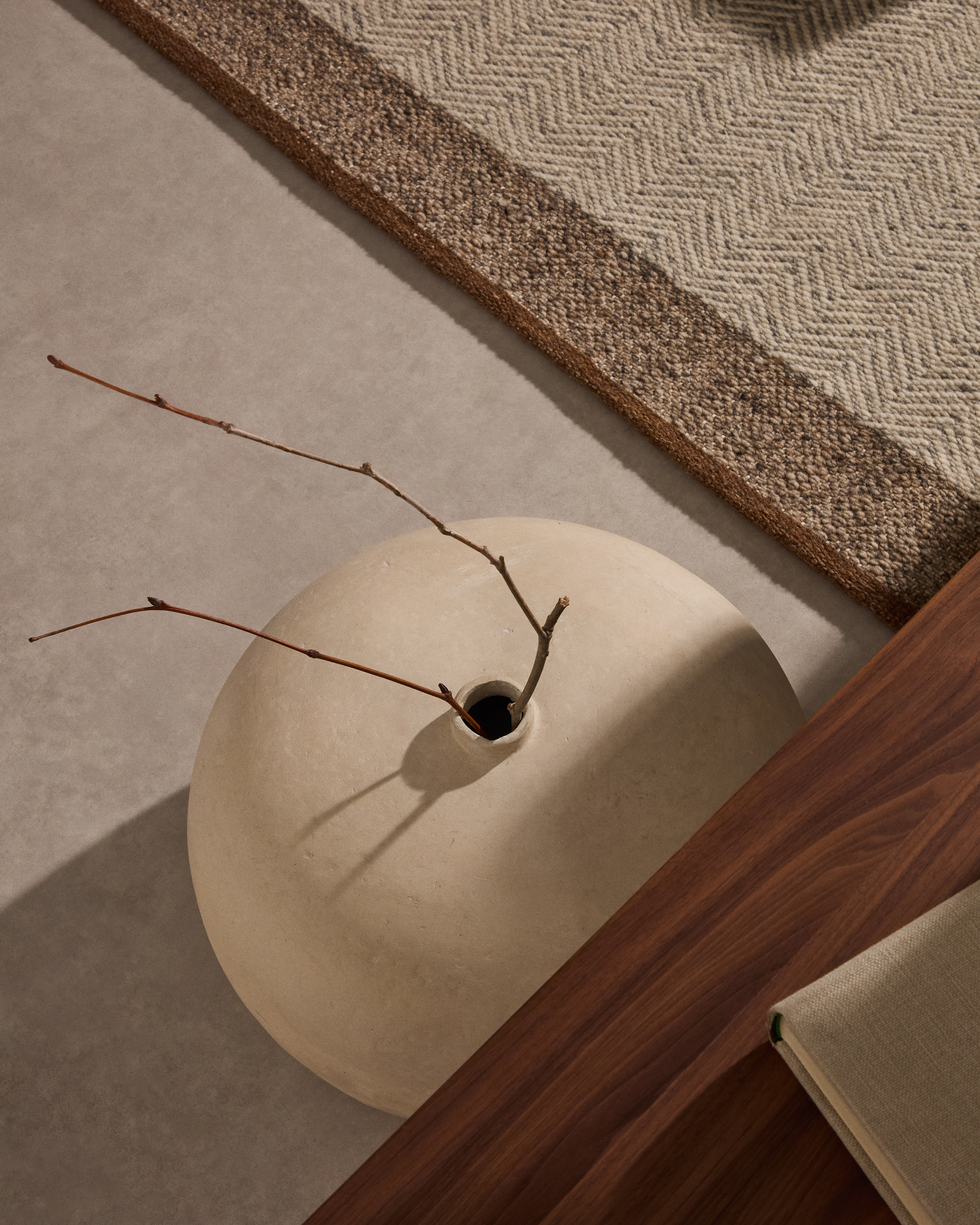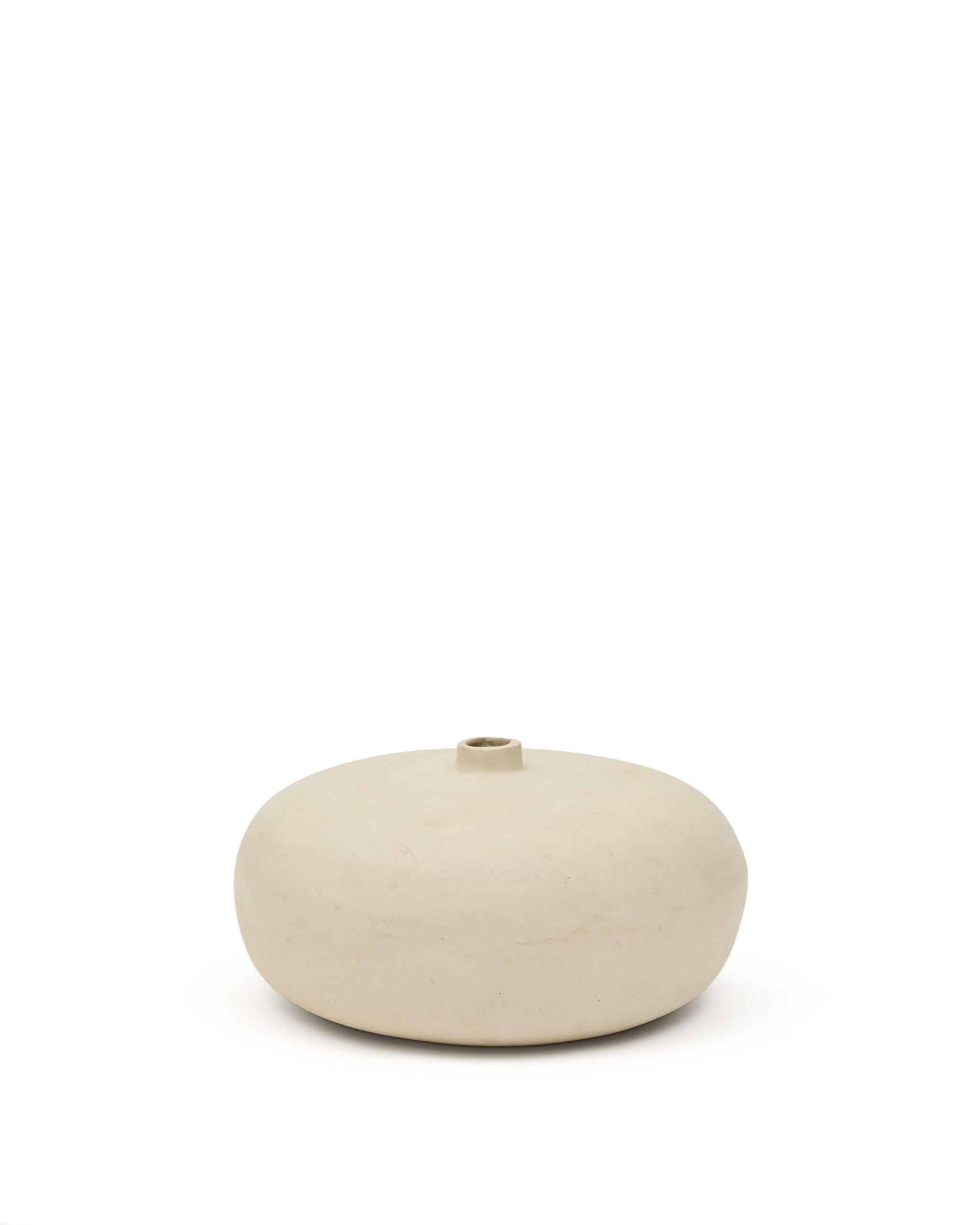 Met zijn ronde vorm en gladde afwerking combineert deze vaas van papier-maché eenvoud en elegantie. Het compacte en organische ontwerp maakt hem een veelzijdig element, perfect om warmte en natuurlijkheid toe te voegen aan elke hoek van het huis.
