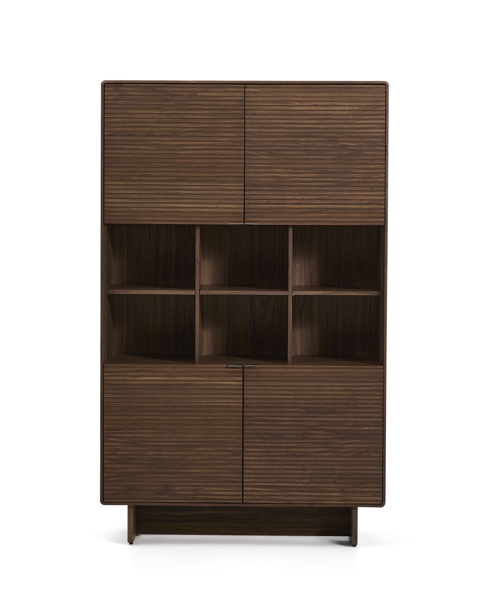 Norlen brengt een ode aan design uit de jaren 50 met een eigentijdse twist, waarbij minimalistische vormen worden gecombineerd met vintage details. De zachte, ronde hoeken en houten basis roepen een nostalgische sfeer op, geherinterpreteerd met pure lijnen en hedendaagse proporties. Het verdonkerde walnootfineer, aangebracht met een vacuümpers, past zich perfect aan op de rondingen van het meubel, waardoor de afwerking een eenheid vormt en elk exemplaar diepte en karakter krijgt. De afwerking van vernis op polyurethaanbasis garandeert slijtvastheid en vochtbestendigheid. De structuur van het meubel is gemaakt van MDF-plaat en de binnenpanelen zijn bedekt met melamine met een afwerking in dezelfde kleur, voor samenhang van het ontwerp. De handgrepen zijn van geborsteld roestvrij staal met een satijnafwerking, die de zichtbaarheid van vingerafdrukken en krassen vermindert en een hoge roestbestendigheid biedt. Bovendien zorgt het schuine ontwerp voor een gemakkelijkere grip bij het openen van de deur. Gecertificeerd met FSC Mix Credit-label, dus gemaakt van een combinatie van materialen uit FSC-gecertificeerde bossen en FSC-gecontroleerd hout. Elk element is ontworpen om functionaliteit te bieden zonder afbreuk te doen aan stijl: van de verstelbare planken aan de binnen- en buitenkant tot het beslag van hoge kwaliteit, met verborgen scharnieren en rails met antiroestafwerking. Bovendien zijn de meubelen voorzien van verstellers in de basis voor een nauwkeurige aanpassing aan elk oppervlak. Een collectie die functionaliteit verandert in een stijlstatement, gemaakt om lang mee te gaan.