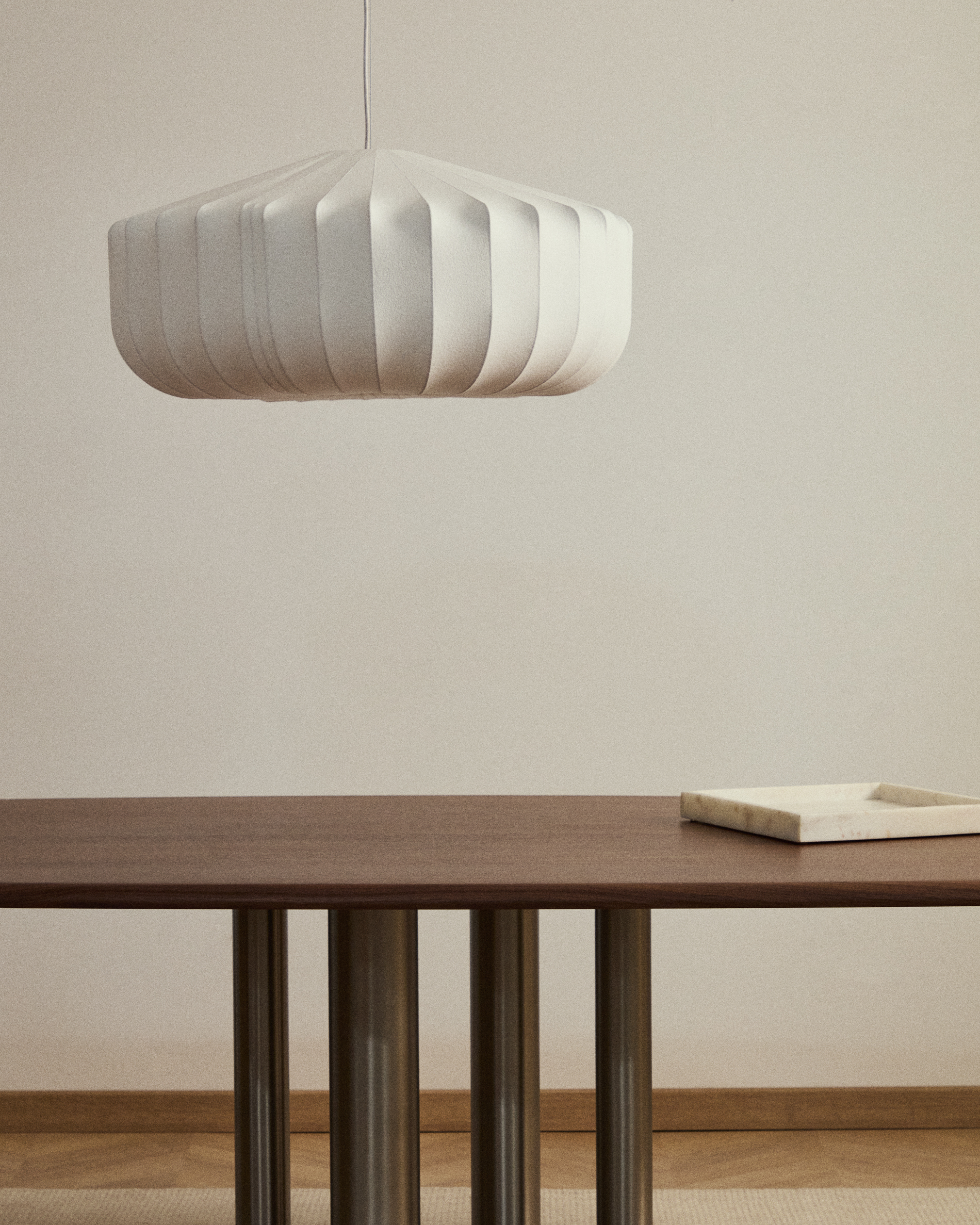 Deze collectie plafondlampen valt op door het innovatieve ontwerp, waarbij de lampenkap is gemaakt van synthetische vezels die op een frame van roterende stalen staven zijn gespoten. Het resultaat is een geometrisch volume dat moderniteit uitstraalt en tegelijkertijd een subtiele klassieke sfeer oproept, perfect om te integreren in alle soorten omgevingen. De combinatie van materialen en productietechnieken zorgt voor een zachte en delicate verlichting die in elke kamer een gezellige en omhullende sfeer creëert. De bekabeling heeft een zachte en flexibele buitenlaag, ontworpen om knoopvorming te voorkomen en dagelijks gebruik te vergemakkelijken. Compatibel met E27-lampen tot 40 W (niet inbegrepen). Een product dat is ontworpen voor diegenen die op zoek zijn naar een onderscheidend en functioneel detail in de verlichting van hun huis of professionele ruimte.