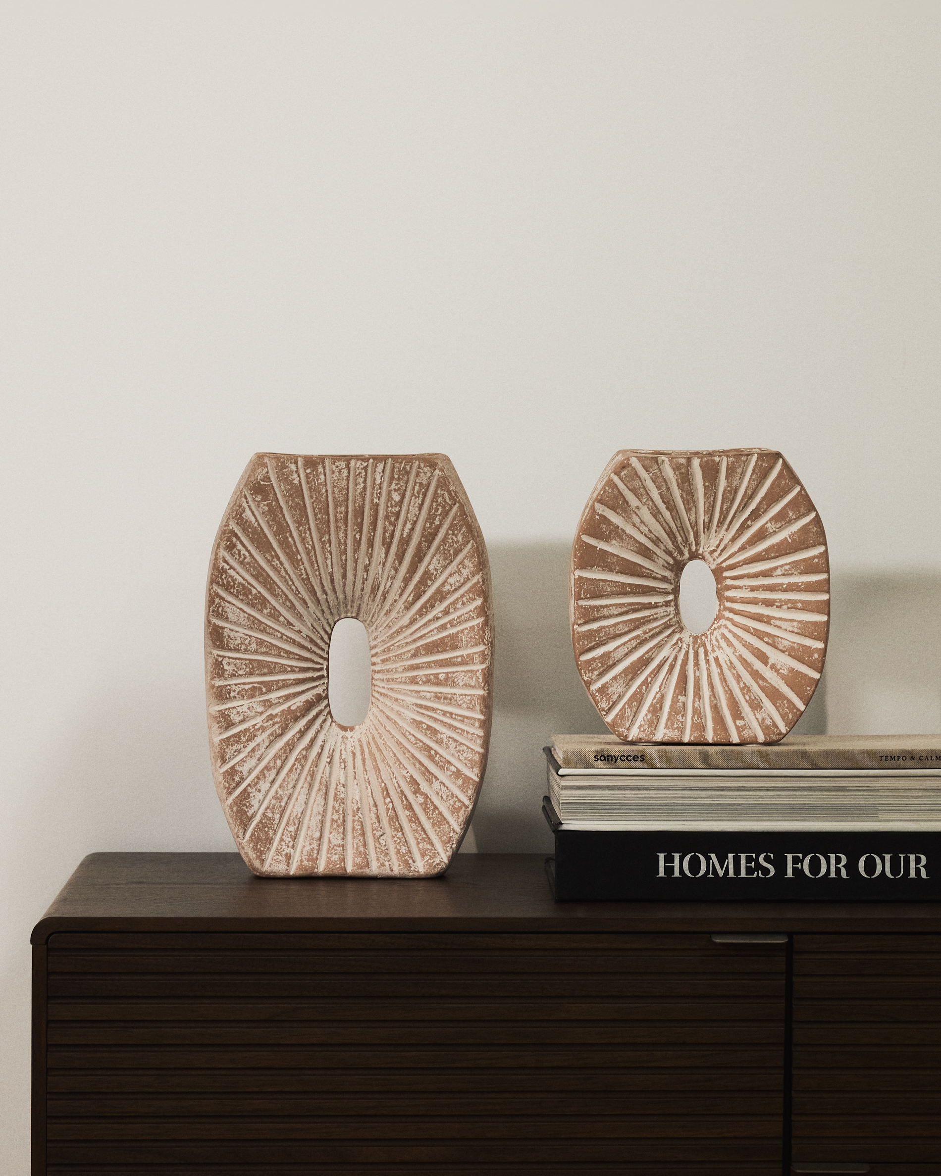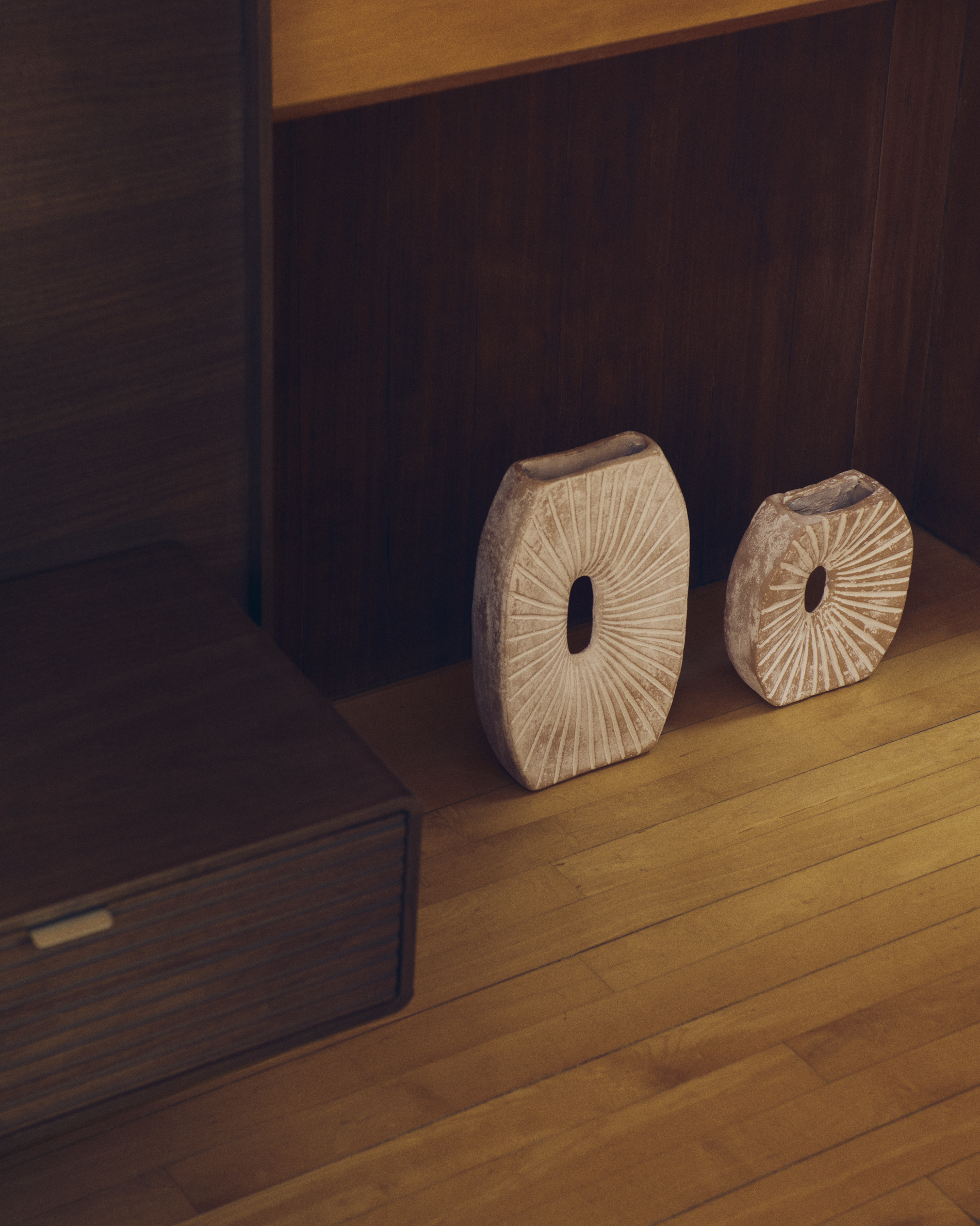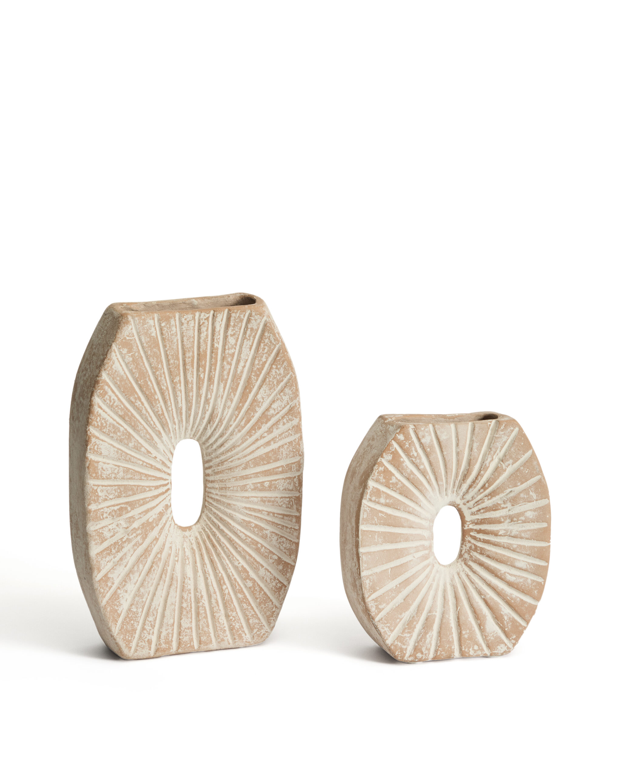 Deze vaas van papier-maché is een sculpturaal object met een verweerd effect. Het ontwerp met stralende lijnen en een centrale opening geeft karakter en persoonlijkheid aan elk interieur. Elke vaas is uniek en vertoont subtiele kleur- en afwerkingsverschillen die typerend zijn voor het materiaal en het ambachtelijke proces. Een decoratief object voor wie op zoek is naar originele en authentieke stukken.