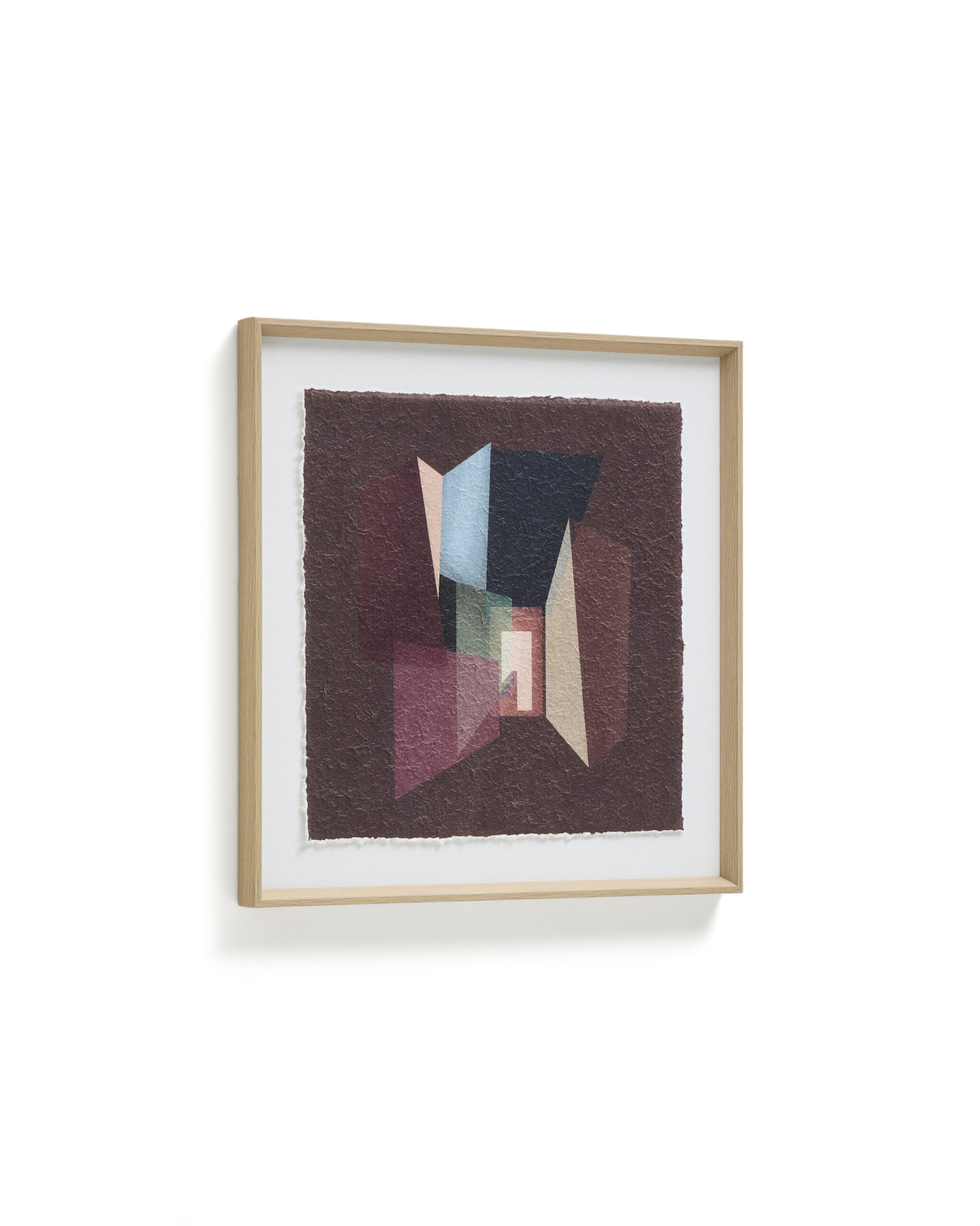 Dit schilderij is geïnspireerd op de kubistische stijl en architectuur uit het midden van de vorige eeuw. Het brengt diepte en karakter in elke omgeving dankzij de combinatie van geometrische vormen en een palet van grijze en bordeauxrode tinten. In dit ontwerp wordt architectuur gedeconstrueerd en gesynthetiseerd om het te weerspiegelen in een uniek artistiek kunstwerk, waar de superpositie van vlakken en het spel met transparanties een visueel effect creëren dat uitnodigt tot contemplatie en een punt van hedendaagse verfijning toevoegt. Het werk is afgedrukt op gerecycled papier en elk detail en elke textuur versterkt de artistieke kwaliteit. De lijst met strakke lijnen zorgt voor visuele lichtheid en laat het werk op zichzelf staan, zodat het gemakkelijk te combineren is met verschillende decoratiestijlen.