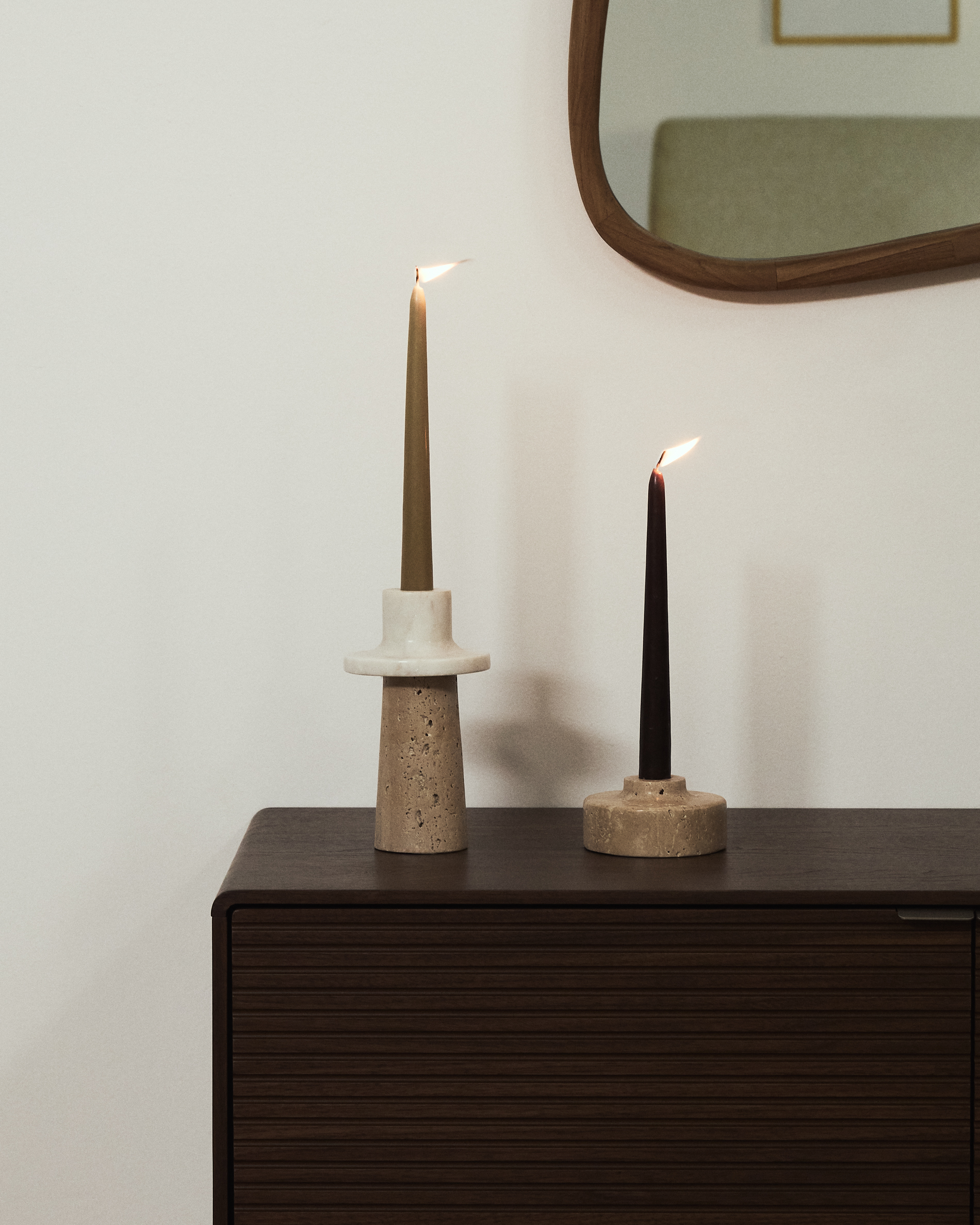 Deze kandelaar van travertijn valt op door zijn karakteristieke textuur van delicate onregelmatigheden en warme tinten. Elk exemplaar heeft zijn eigen nuances en aderen die het uniek maken. Het gewicht en de stevigheid zorgen voor een stabiele basis voor de kaars, terwijl de strakke lijnen en evenwichtige proporties het een veelzijdig decoratief element maken voor verschillende ruimtes in huis.