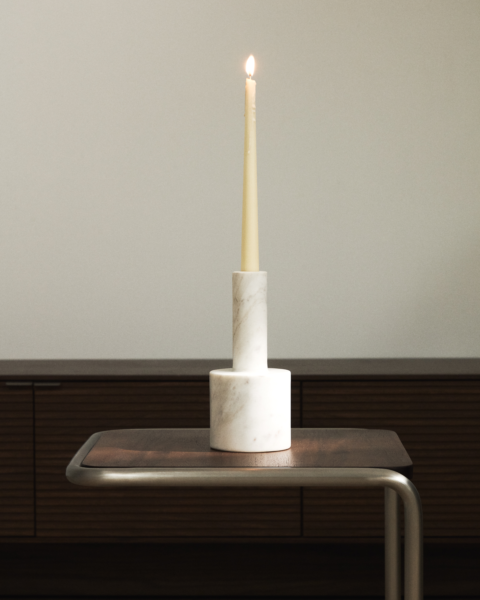 Deze marmeren kandelaar onderscheidt zich door zijn elegante aanwezigheid en zijn aderen die hem uniek maken. Het gepolijste oppervlak weerkaatst het licht subtiel en zorgt voor een zachte glans die de verfijning van de omgeving versterkt. Het gewicht van het marmer garandeert stabiliteit en veiligheid bij het plaatsen van de kaars, terwijl de eenvoudige lijnen en evenwichtige proporties het een tijdloos object maken, ontworpen voor zowel een klassieke als hedendaagse omgeving.