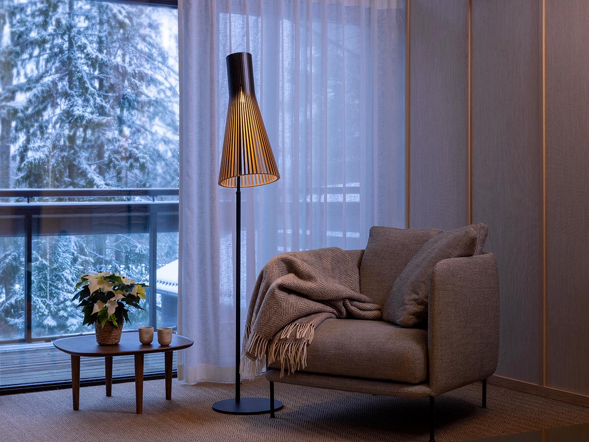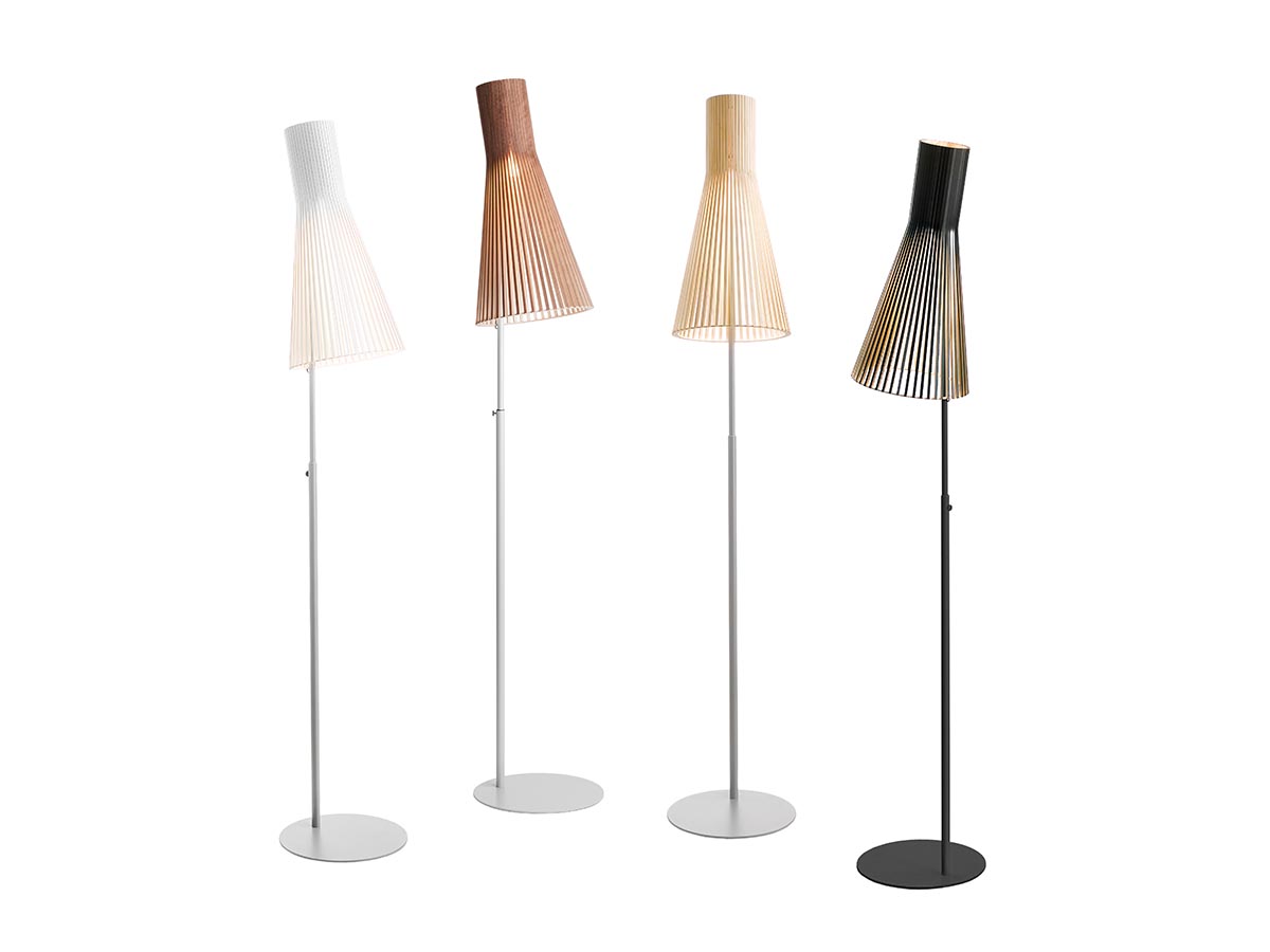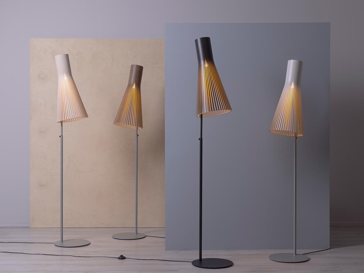 De Secto 4210 vloerlamp, ontworpen door Seppo Koho, is een slanker en langgerekt ontwerp dat het principe van de lattenlamp vertaalt naar een staande vorm. Deze lamp biedt direct functioneel licht én esthetiek door een hoogstaande vormgeving waarin licht langs de houten latten geleidelijk wordt gefilterd.