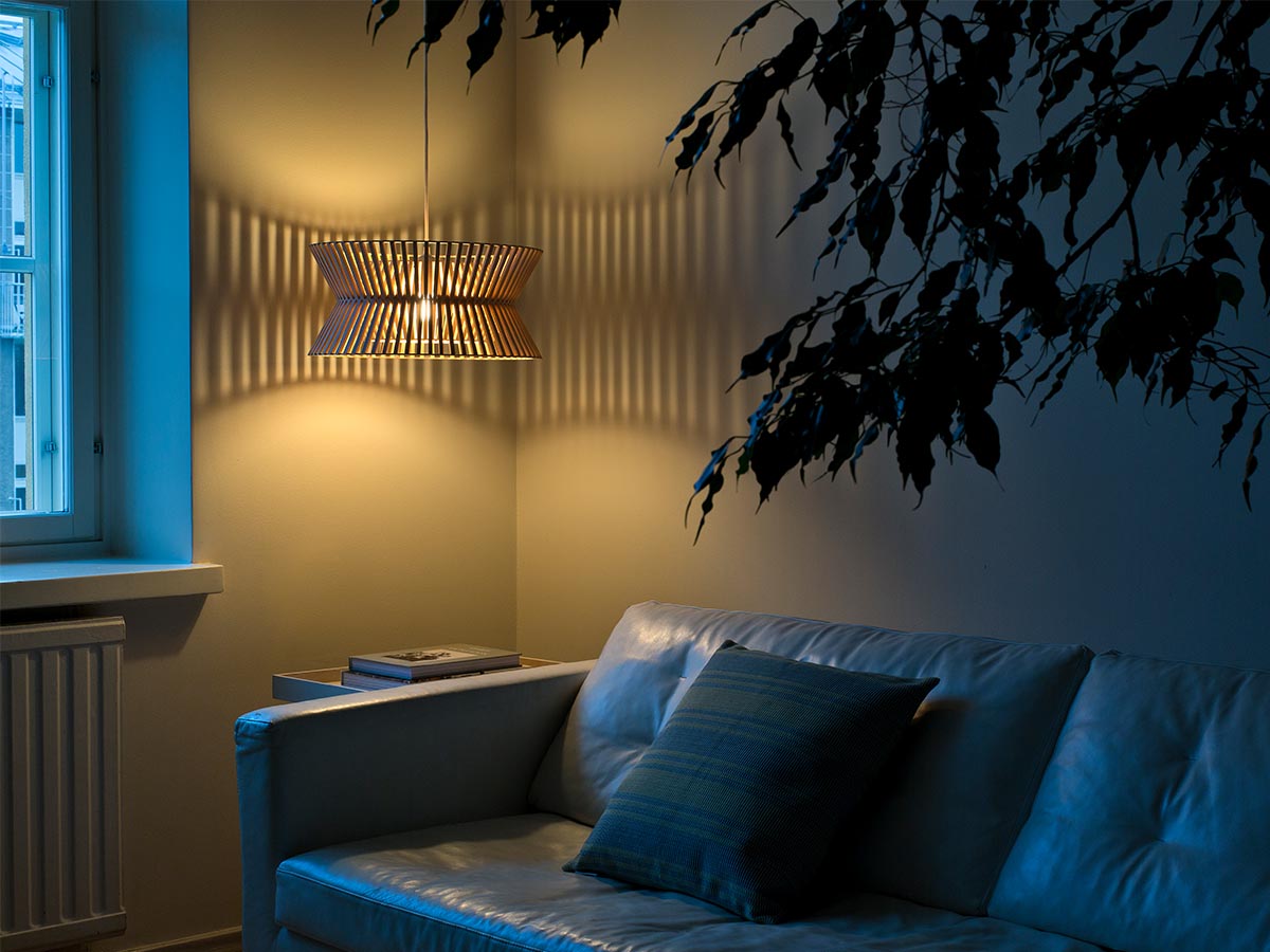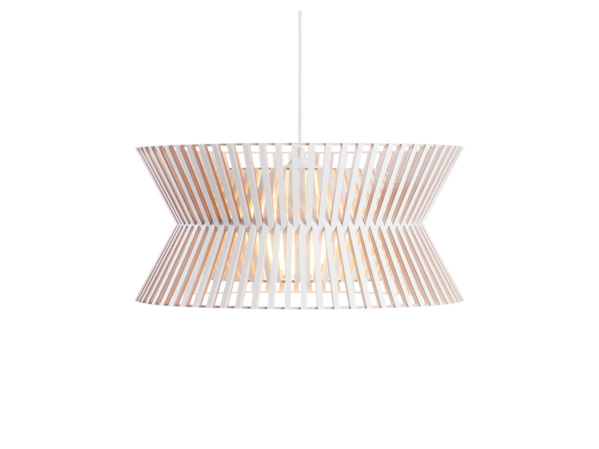 Met een slank silhouet en proporties die geschikt zijn voor kleinere en middelgrote ruimten, verspreidt de Kontro 600 een zachte, diffuse gloed door de houten latconstructie. Het gebruik van vormgeperst berkenhout zorgt voor natuurlijke warmte en structuur. De kap is beschikbaar in afwerkingen zoals naturel, wit of zwart laminaat.