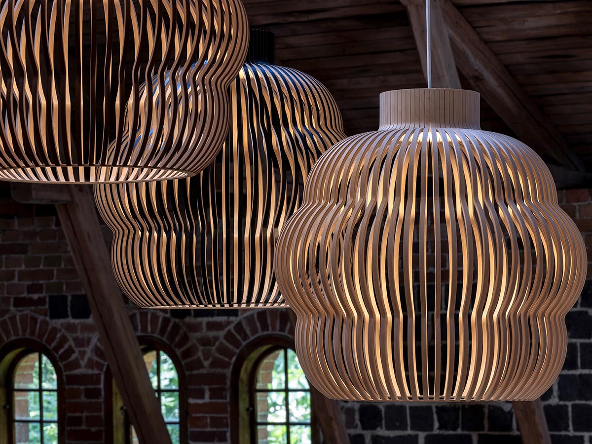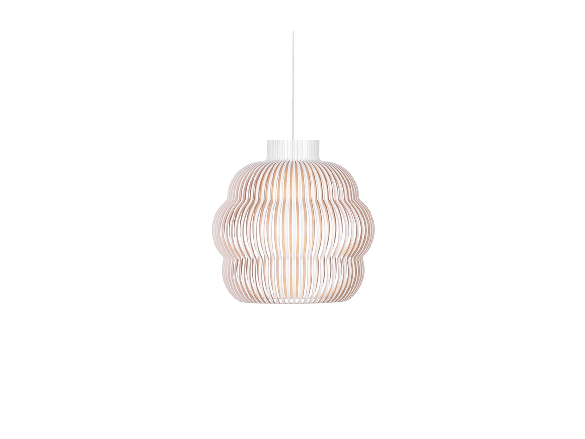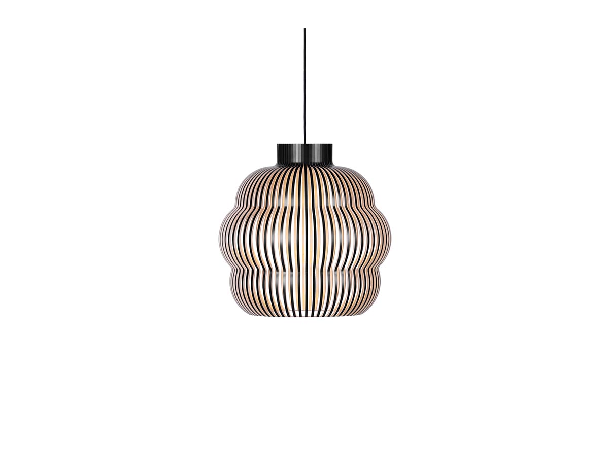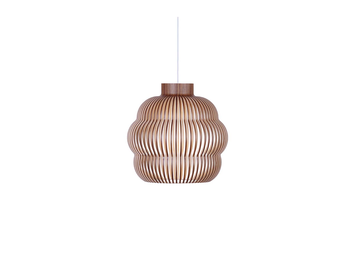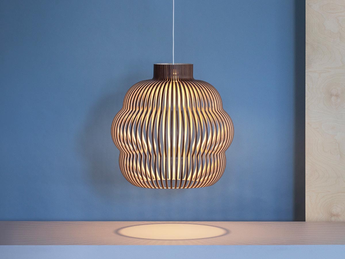 De kap bestaat uit vormgeperste berkenhouten latten, in een uitneembaar patroon dat herinneringen oproept aan wolken. Licht stroomt door de smalle openingen, waardoor een warme, diffuse gloed ontstaat. U kunt kiezen uit afwerkingen zoals naturel berken, zwart of wit gelamineerd, of walnoot fineer — passend bij moderne en klassieke interieurs.
