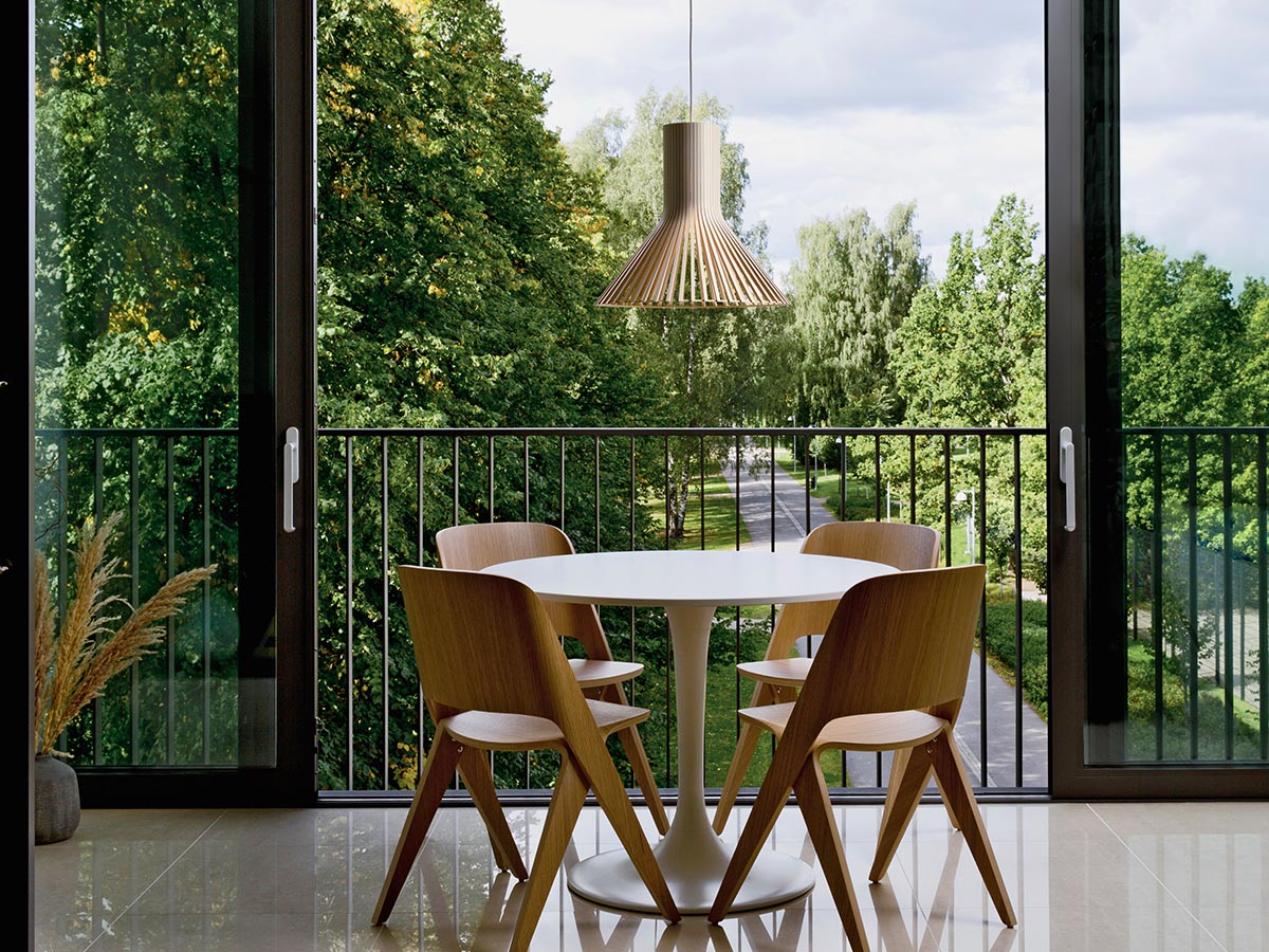 Het ontwerp van architect Seppo Koho kenmerkt zich door een brede lichtbundel, waardoor deze lamp ideaal is voor het belichten van tafeloppervlakken of werkplekken zonder te verblinden.De houten lattenlatstructuur zorgt voor warme reflecties en subtiele schaduwlijnen, die een ruimte sfeer en karakter geven.